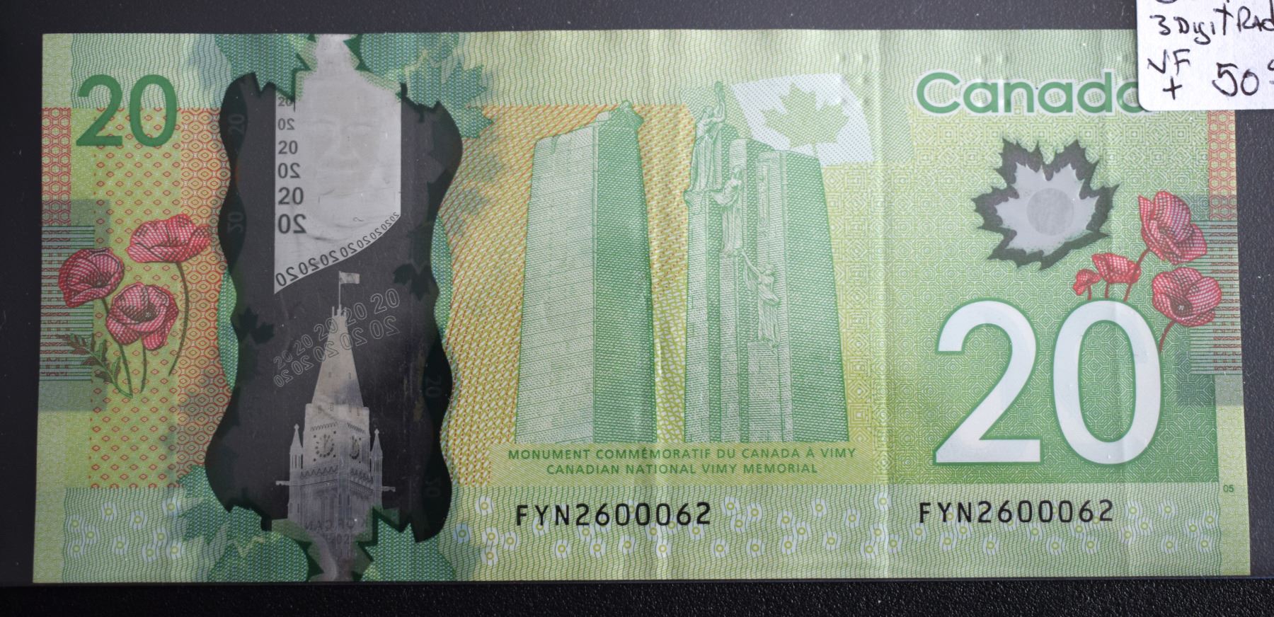 Canada, 20$ 2012 "3 Digits Radar" Serial # FYN2600062 VF+ BC-71b QEII
