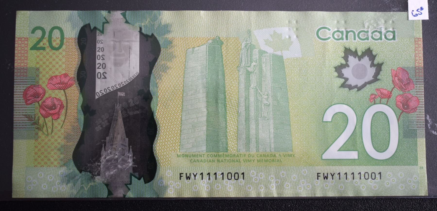 Canada, 20$ 2012 "Binary Note" Serial # FIU-1111001 VF++ QEII