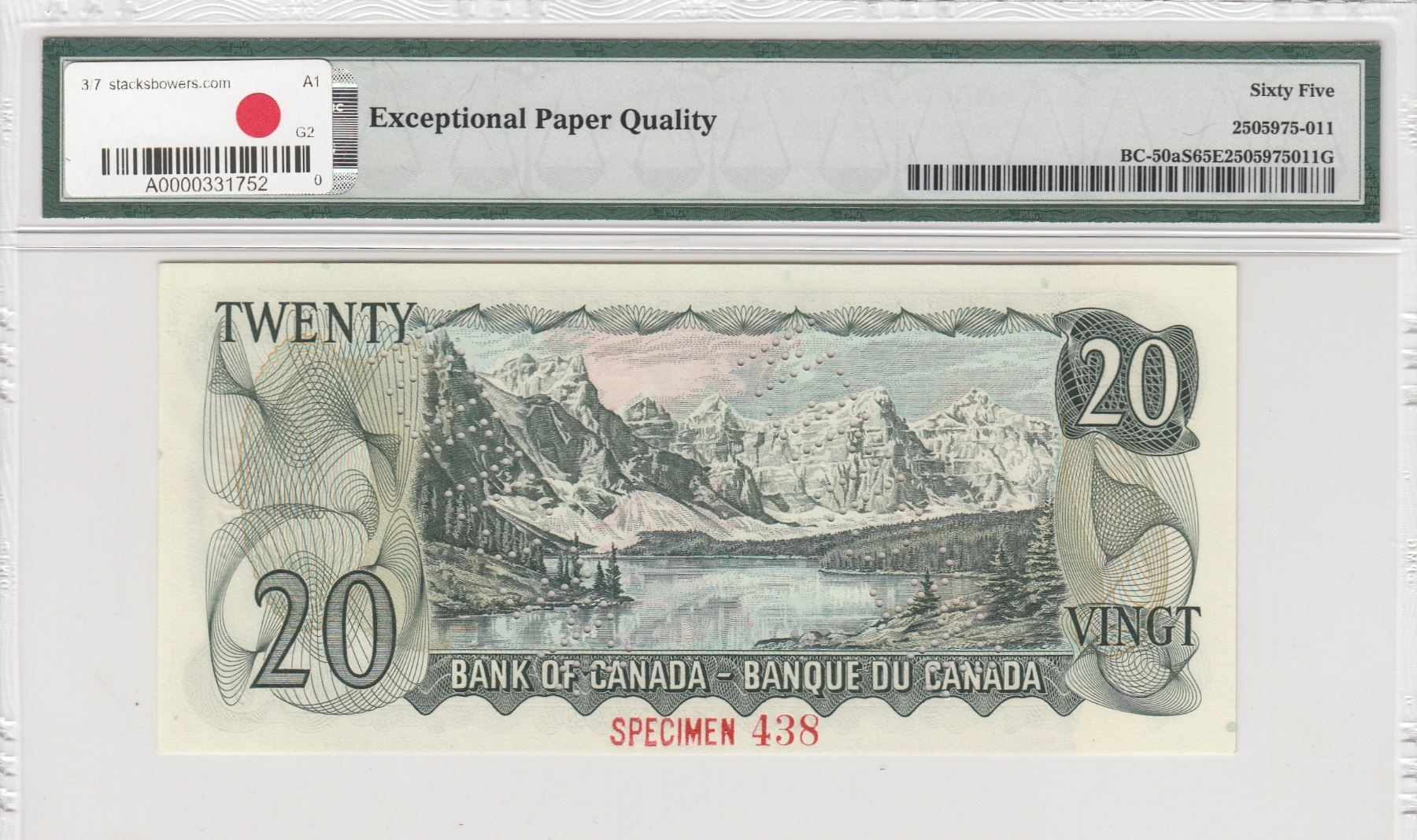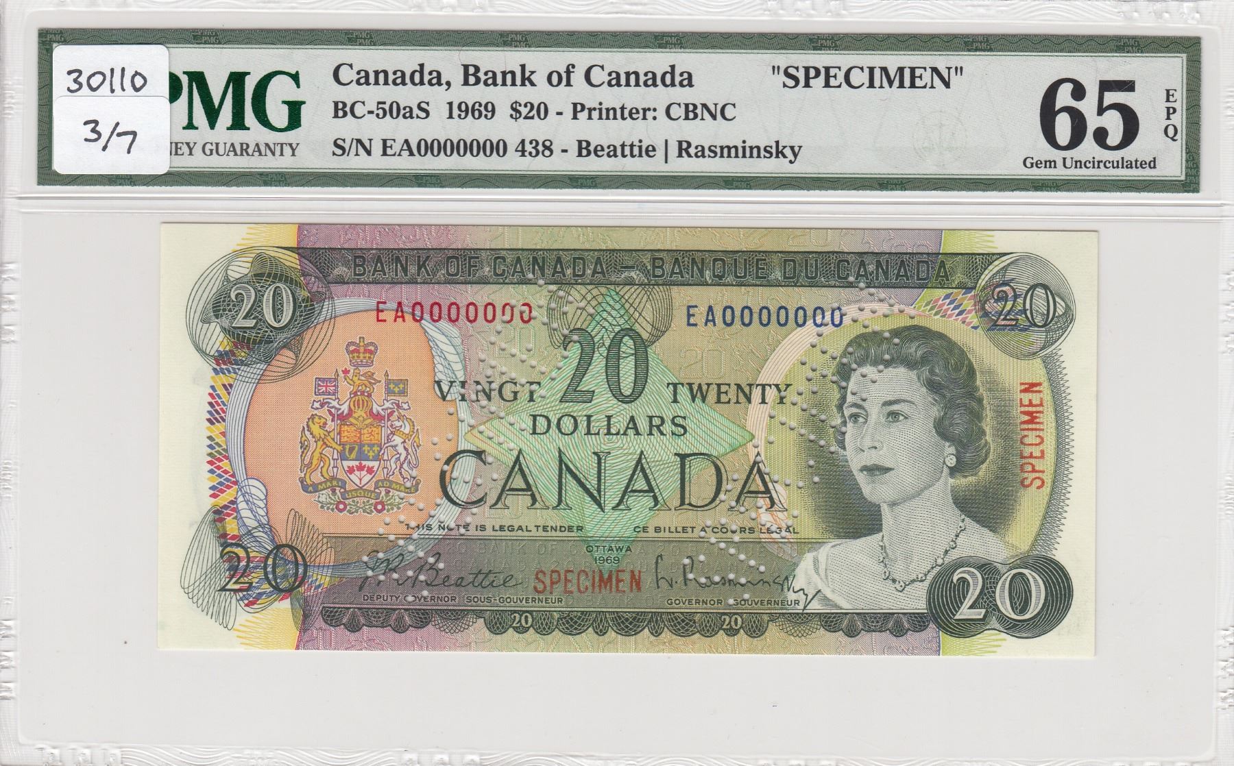 Canada, 20 Dollars, 1969, UNC, p89as, SPECIMENbr/PMG 65 EPQ, Queen Elizabeth II portrait, serial number: EA 00000000