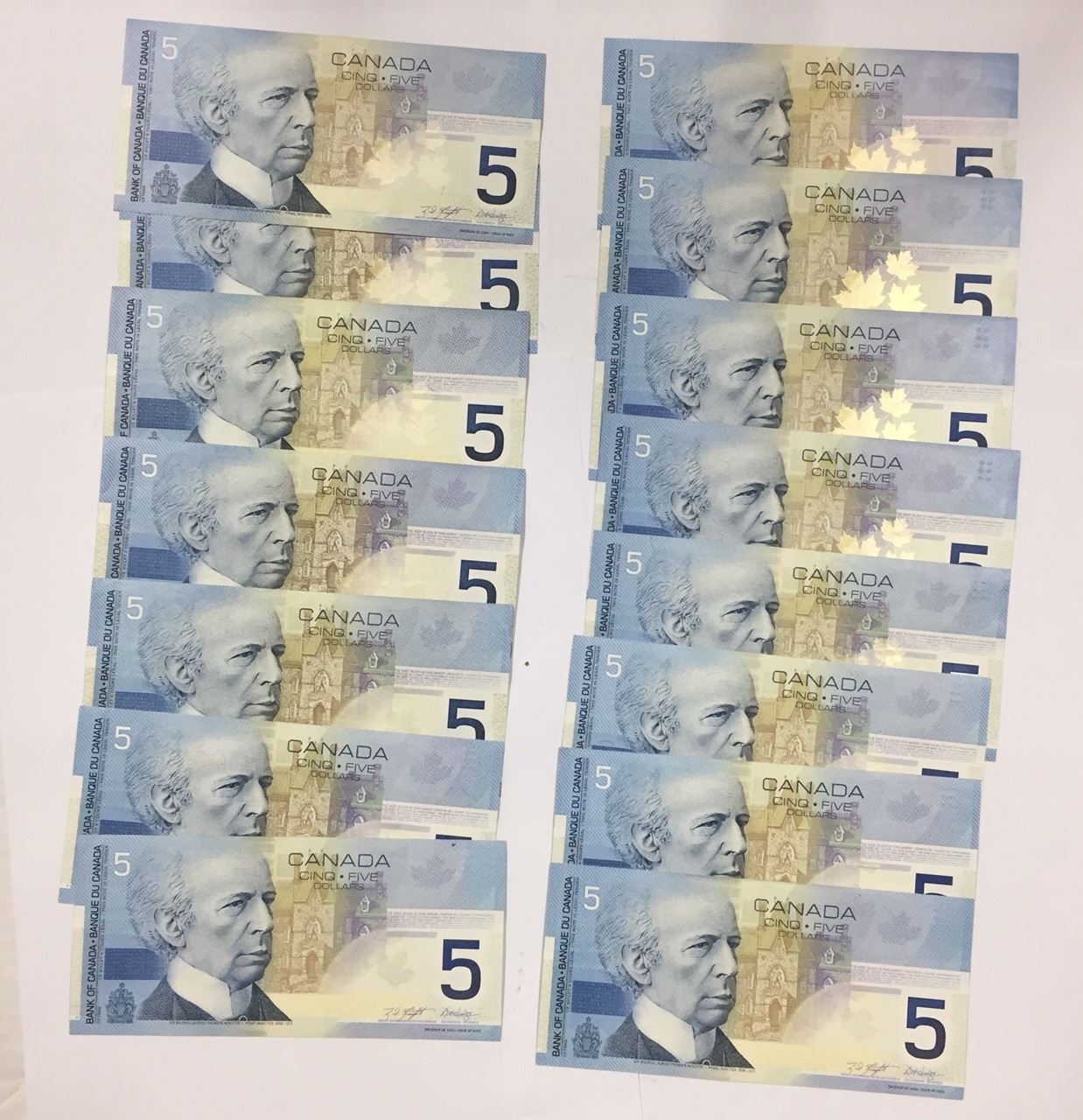 Canada 2002 Journey Series $5 Banknotes (lot of 15) AU-UNC. Mixed signatures and prefixes.