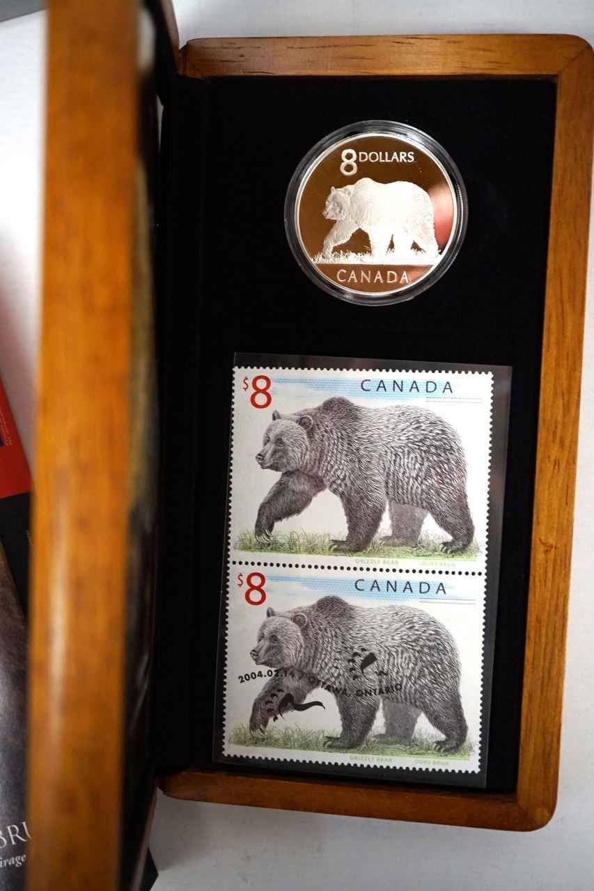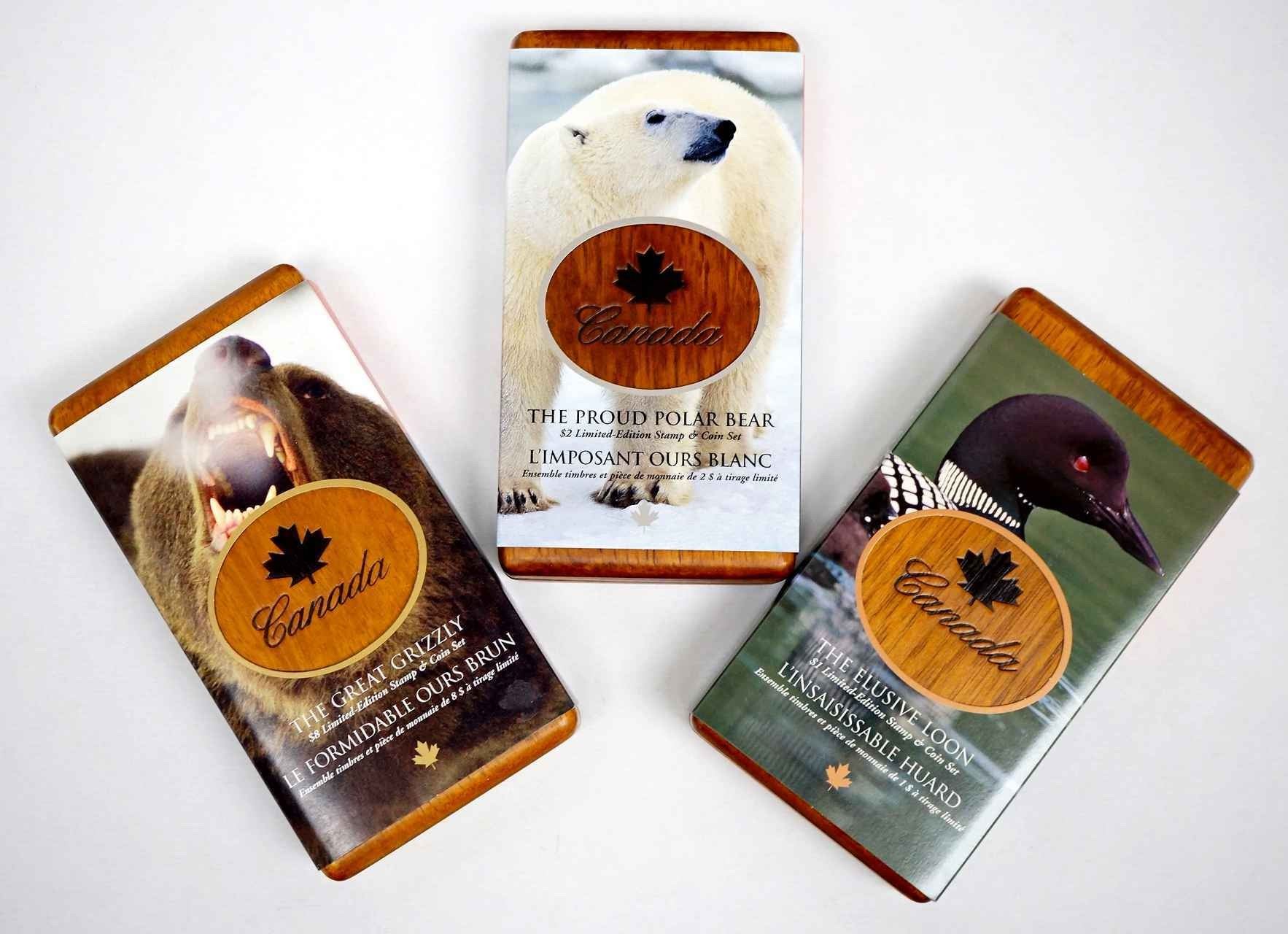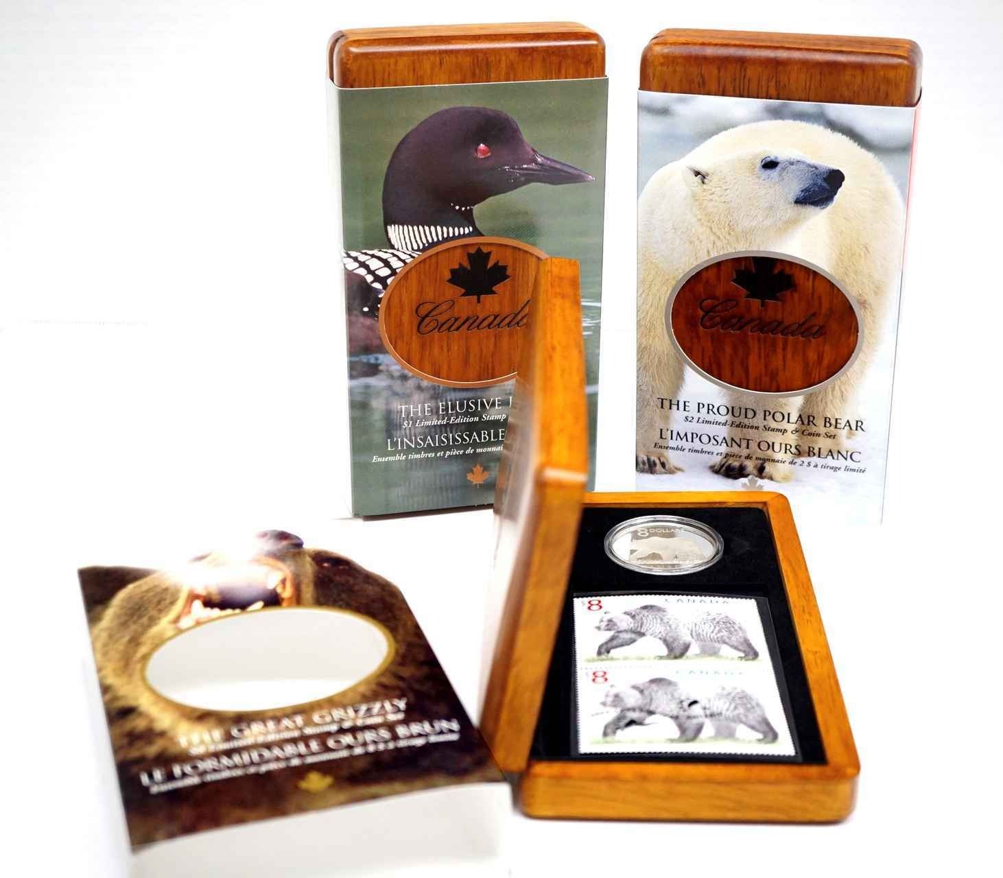 28.8 gms. .9999 1 x Elusive Loon, 1 x Proud Polar Bear and 1 x Great Grizzly. All with wood box, stamps, COA and sleeve.