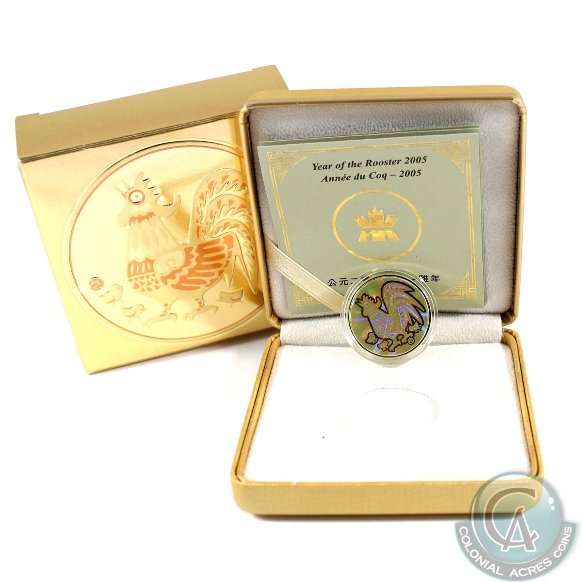 $150 2005 18K Gold Hologram Year of the Rooster in Original Mint Packaging. Coin contains 0.2850 oz of pure gold.