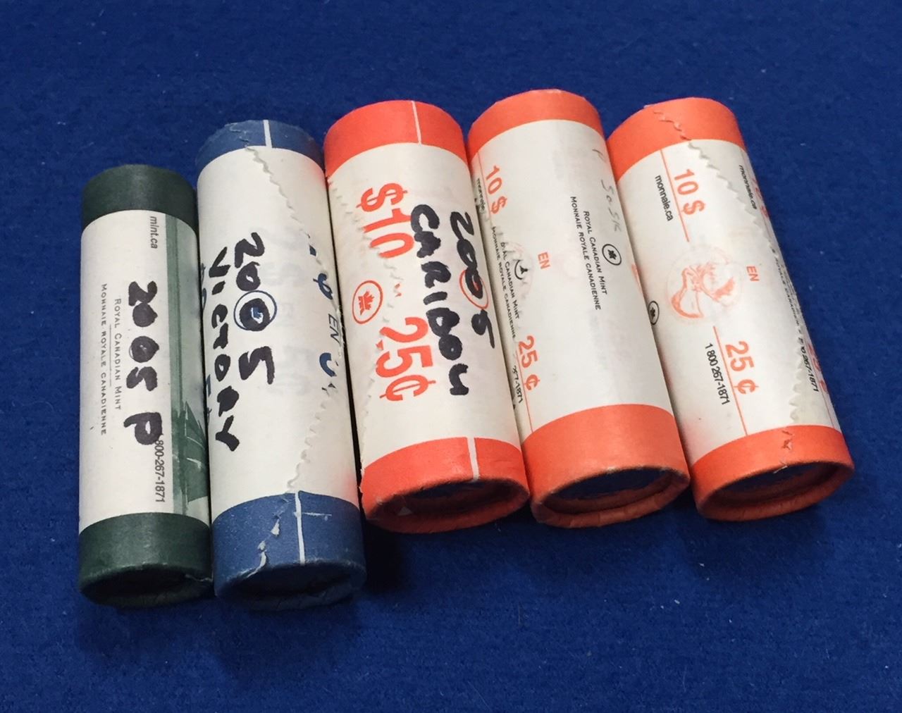 Canada 2005 Rolls 5c Victory, 10c P, 25c Caribou P, 25c Veterans, 25c Saskachewan