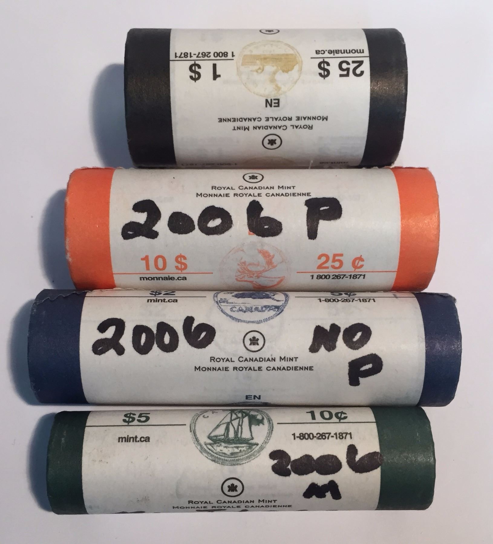 Canada 2006 Rolls 5c No P, 10c Logo, 25c with P, Lucky Loonie ($42 Face Value)