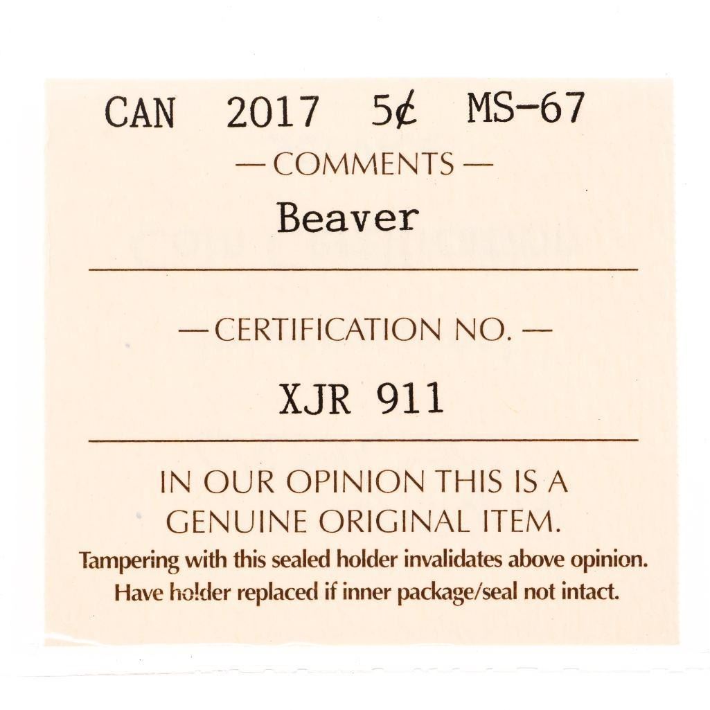 Canada 2017 Five Cents Beaver MS67 ICCS - - COIN~232