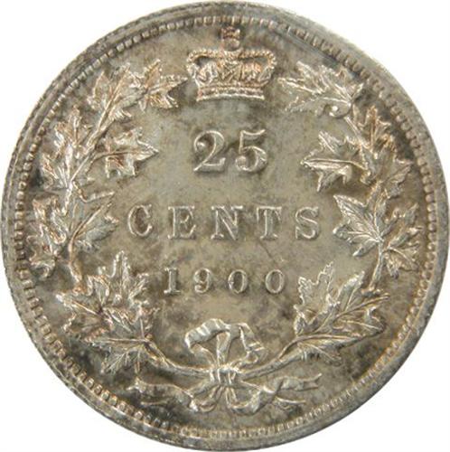Canada Twenty-Five Cents 1900 Norweb ICCS MS-65. This is a fully struck piece with great lustre and near flawless surfaces that are attractively toned in pale golds with light amber and iridescent blue accents. It is tied with three other examples as the highest graded by ICCS. From the Norweb and the Point Grey Collections