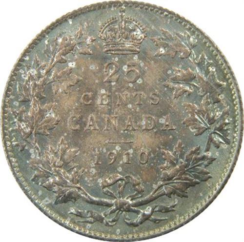 Canada Twenty-Five Cents 1910 Norweb ICCS MS-65 PQ. This is a fully struck piece with great lustre and near flawless surfaces that are beautifully toned in light-medium golden ambers with iridescent blue overtones adding to the overall Great Eye Appeal. It is tied with four others as the highest graded by ICCS and PCGS has graded only one higher. From the Norweb and the Point Grey Collections