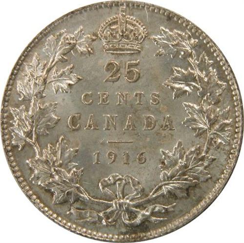 Canada Twenty-Five Cents 1916 Norweb ICCS MS-64. This is a fully struck piece with strongly lustrous and near flawless surfaces that have an attractive pale golden toning. It is tied as the third highest graded by ICCS. From the Norweb Collection