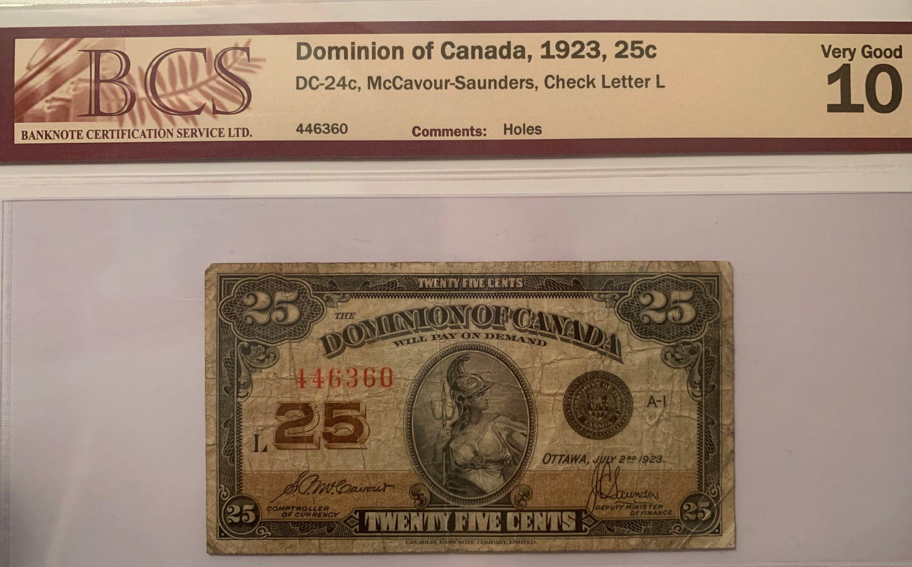Canada 25 cent 1923 Dominion of Canada 25c Shinplaster DC-24c McCavour Saunders Check Letter L BCS 10 Very Good Holes