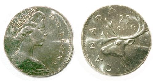 Nickel 25 cent struck on 10 cent planchet.