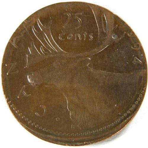 Canada Twenty-Five Cents 1981 Struck on a smaller non-magnetic bronze coloured planchet, 2.48 grams, 20mm with reeding from 6 to 7 o’clock only, Uncirculated and toned