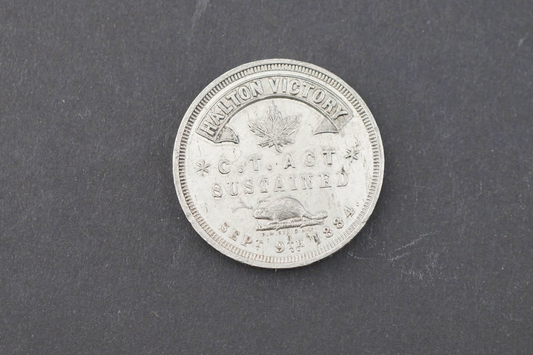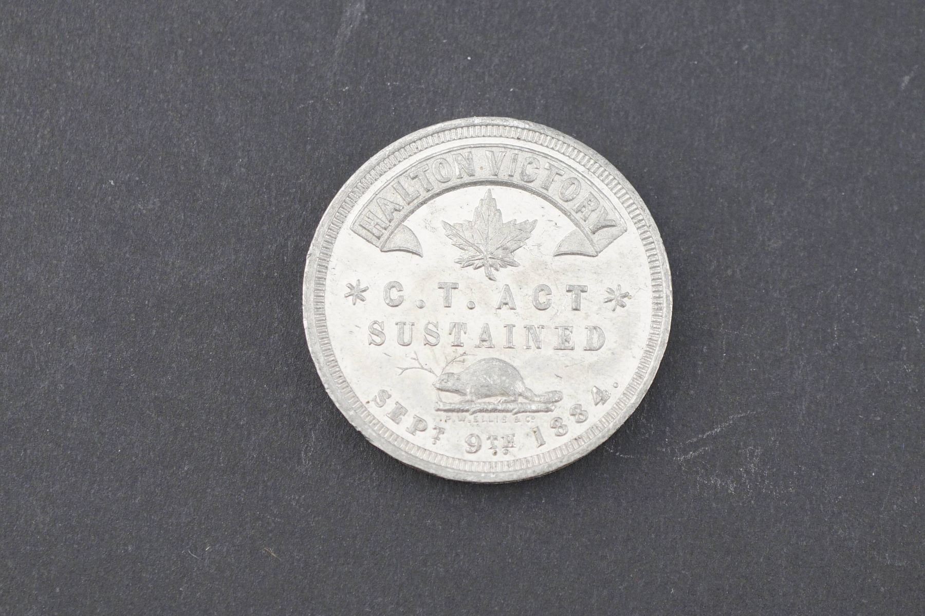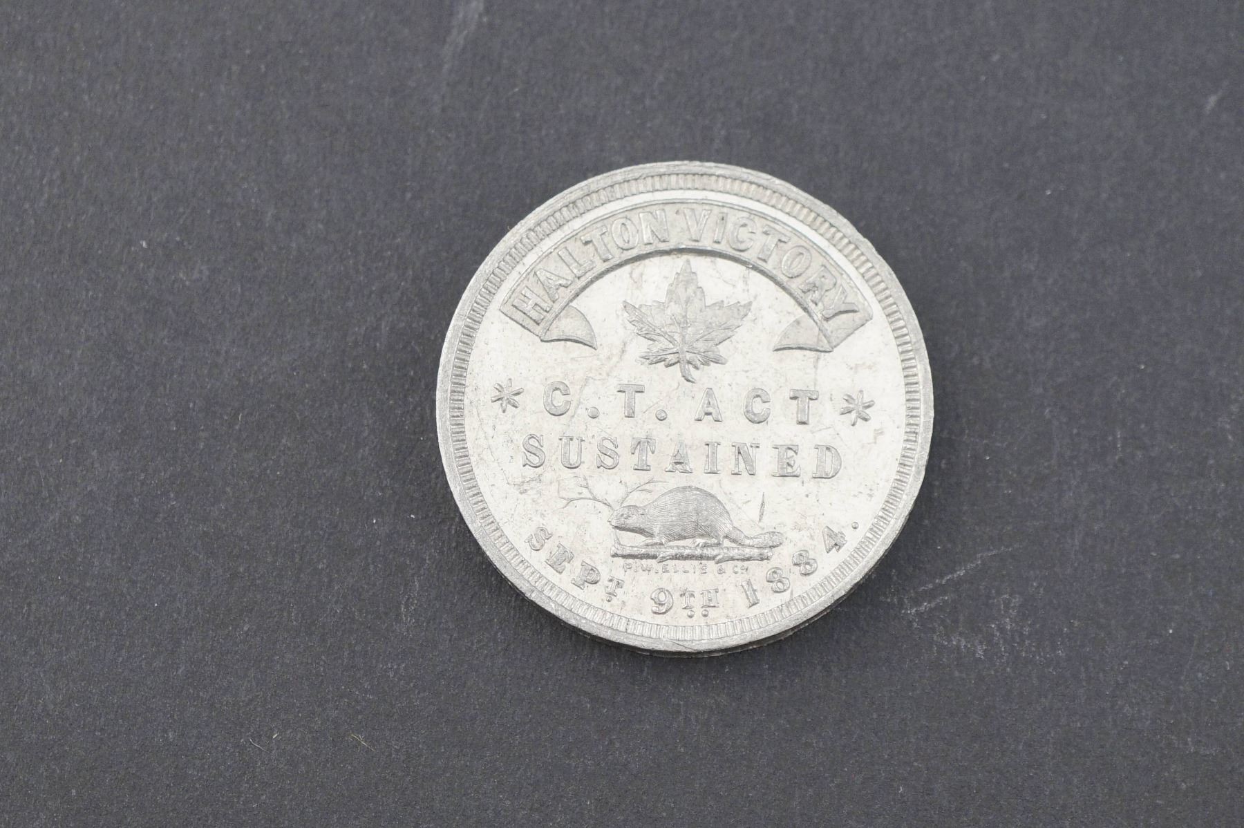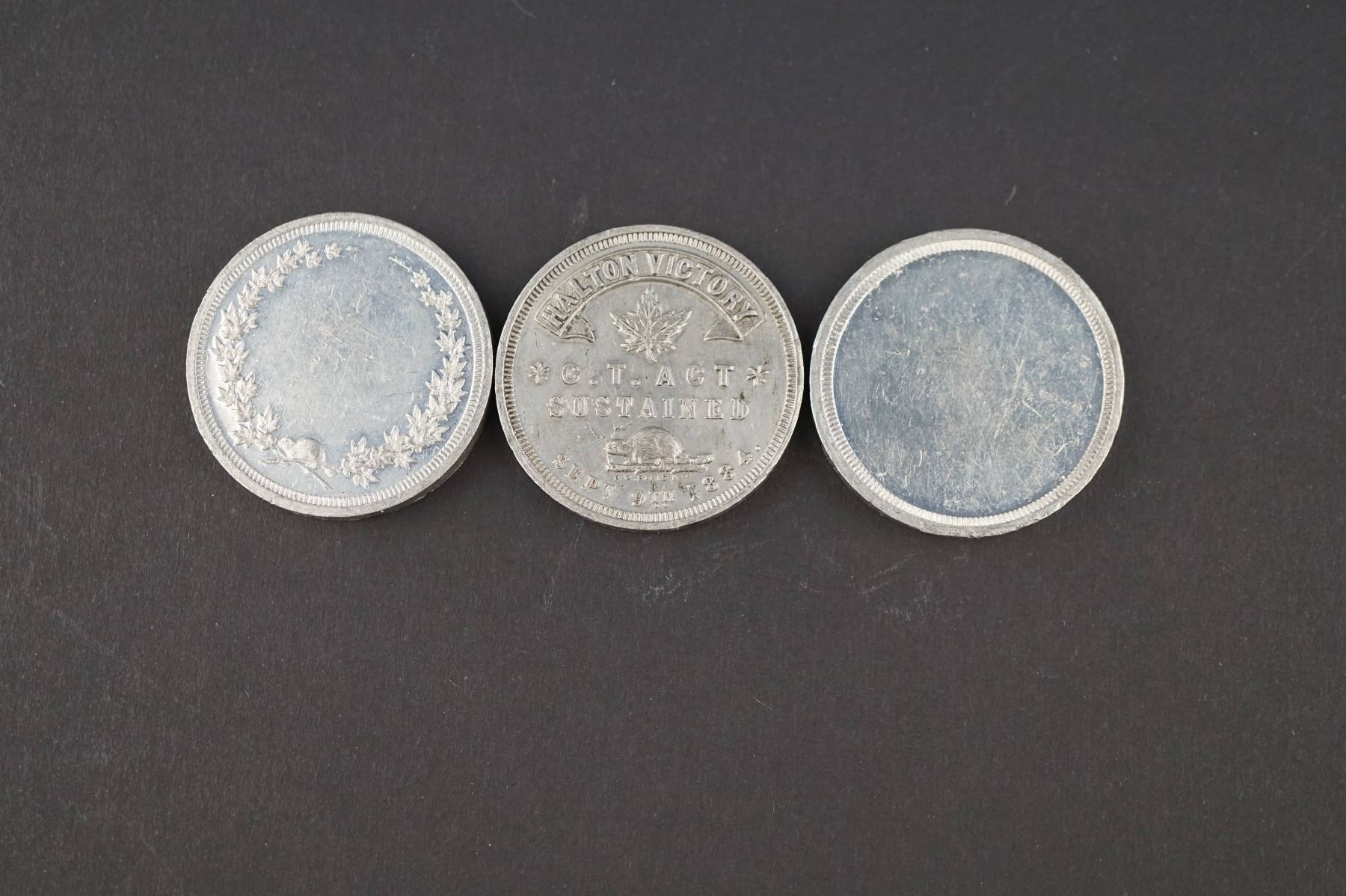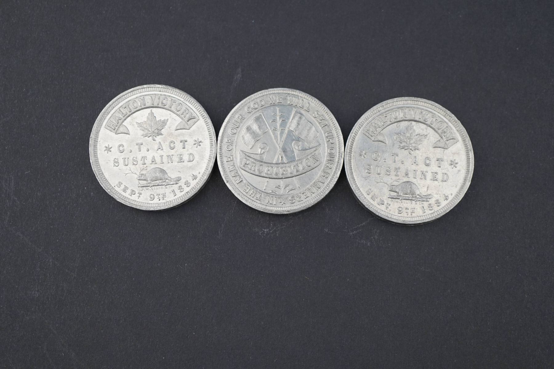 3 Pcs Unlisted. 1884 Halton Victory C.T. Act Sustained w/rev.: Prohibition wm-31, 13.1 grs. Halton. Obv.: w/rev beaver and wreath of maple leaves, wm-31, 15.3 grs & Halton. Obv.: w/rev. Plain, WM-31, 14.5 grs. all in EF. Possible complete set.