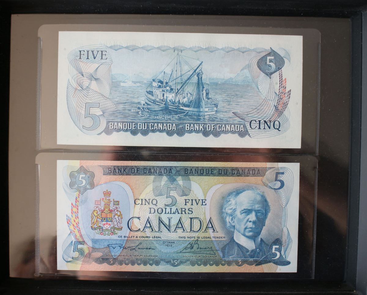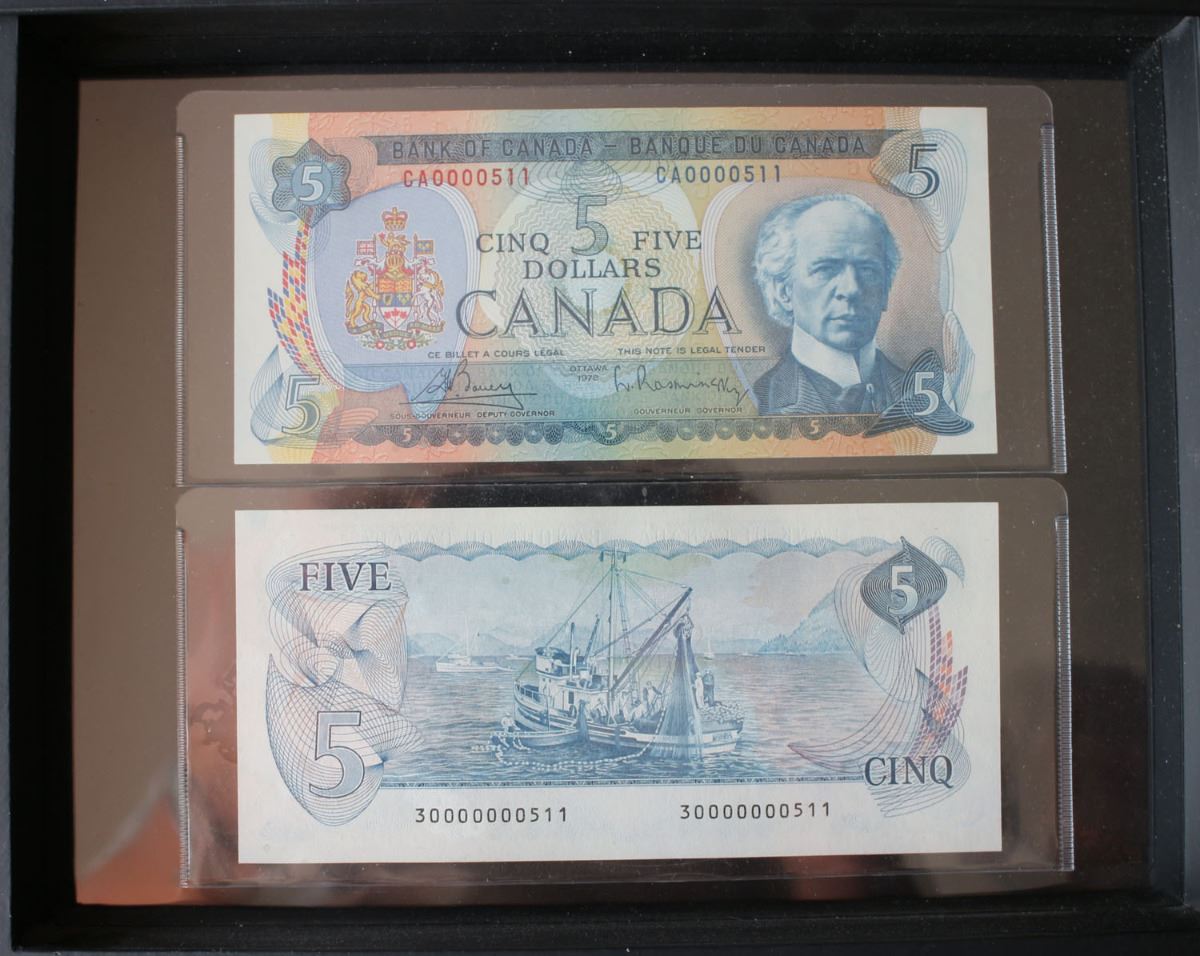 Canada $5 Bank Notes 1972 & 1979 with matching serial # in display. BC-48A 1972 $5 CA0000511& BC53A 30000000511 both in Uncirclated Condition