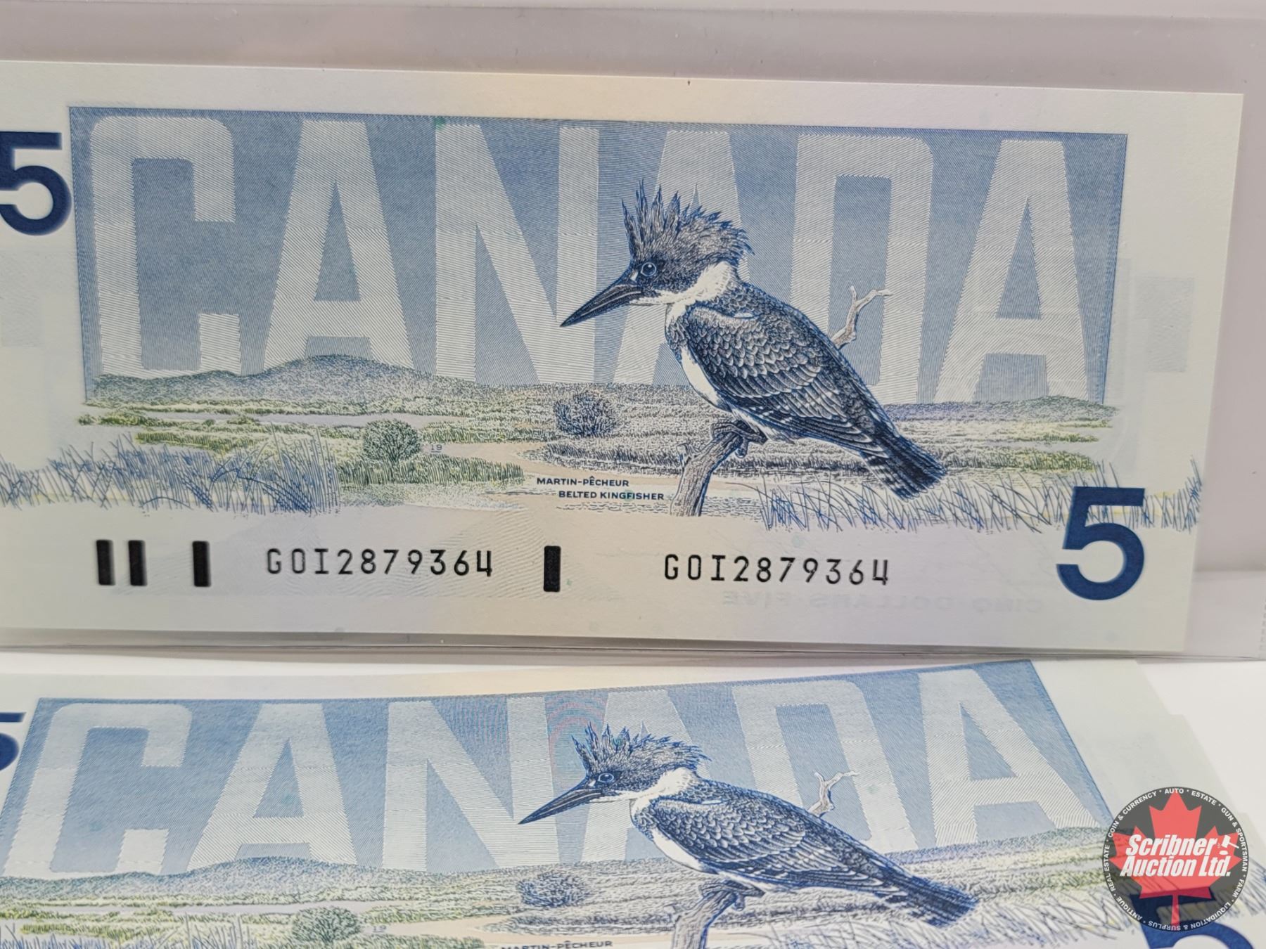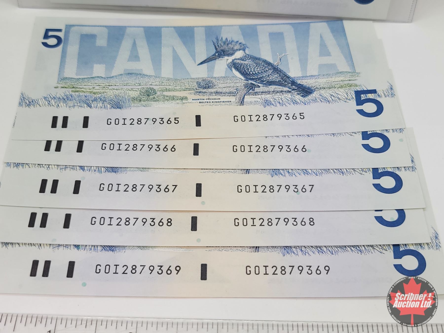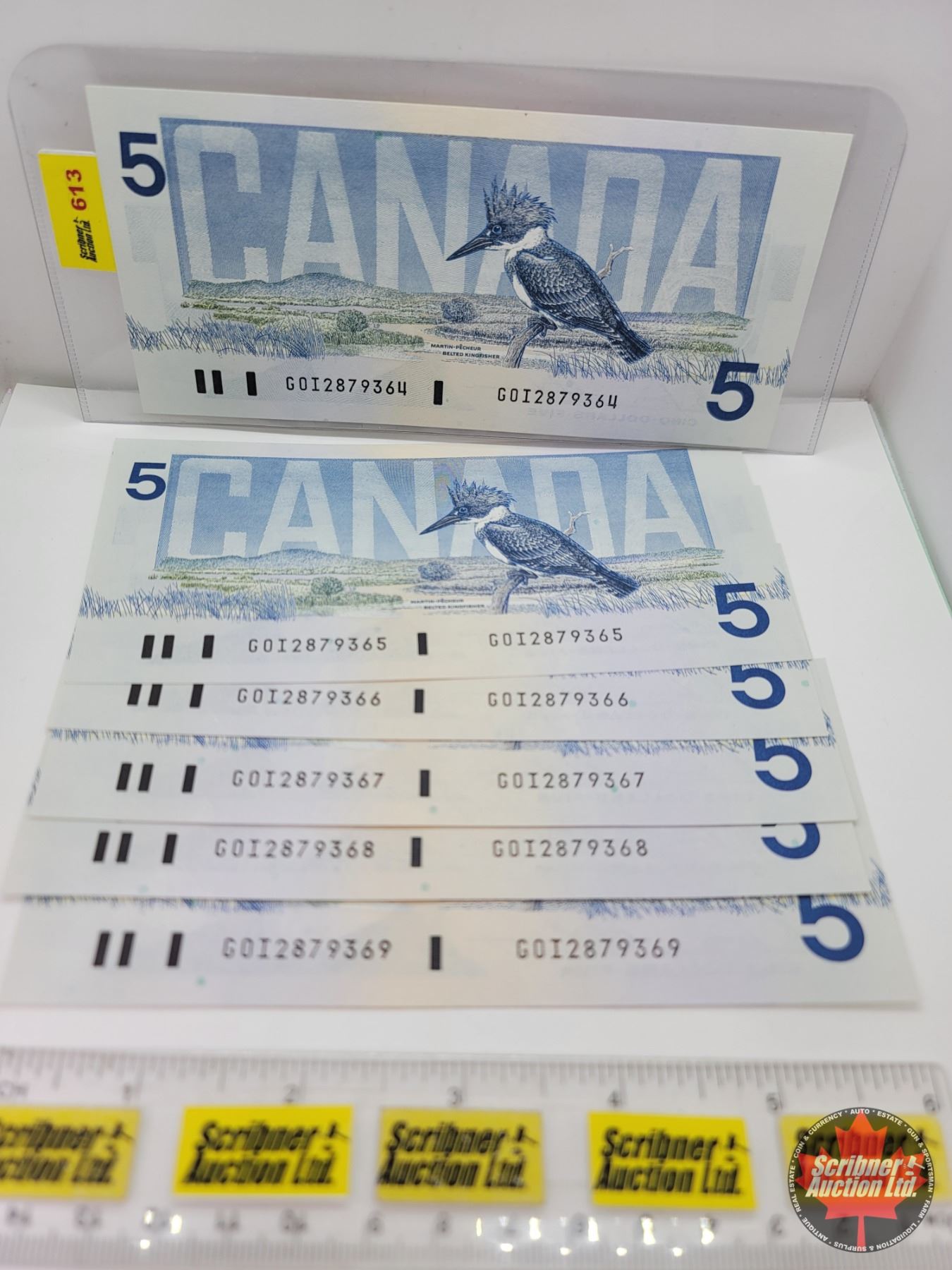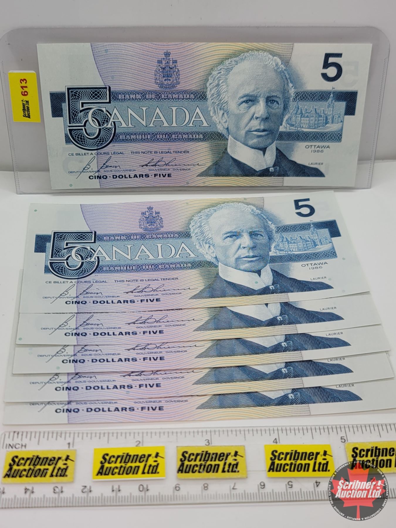 Canada $5 Bills 1986 (6 Sequential UNC) : Bonin/Thiessen #GOI2879364-369 (See Pics for Varieties, Conditions, Serial Numbers & Signatures)