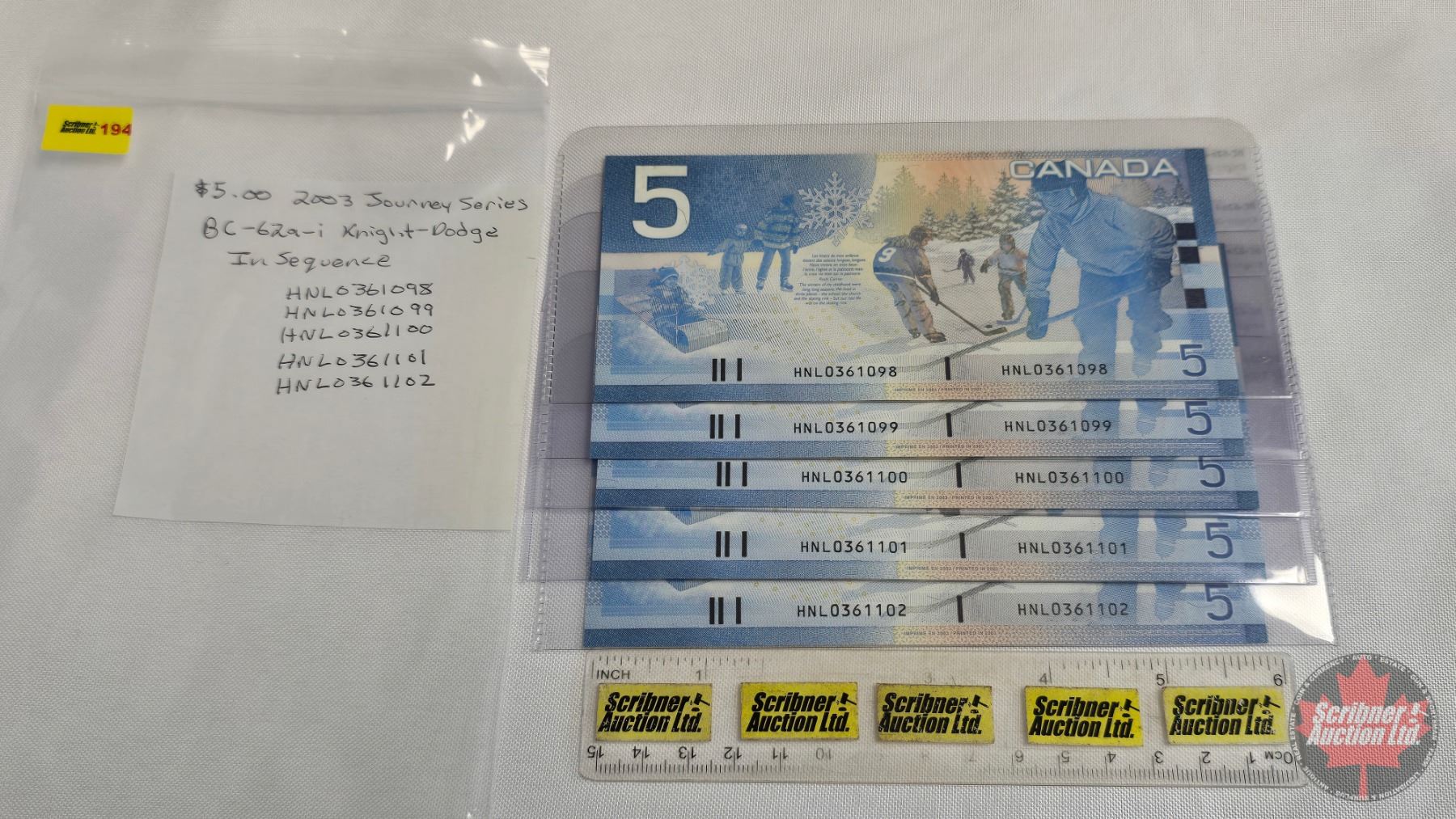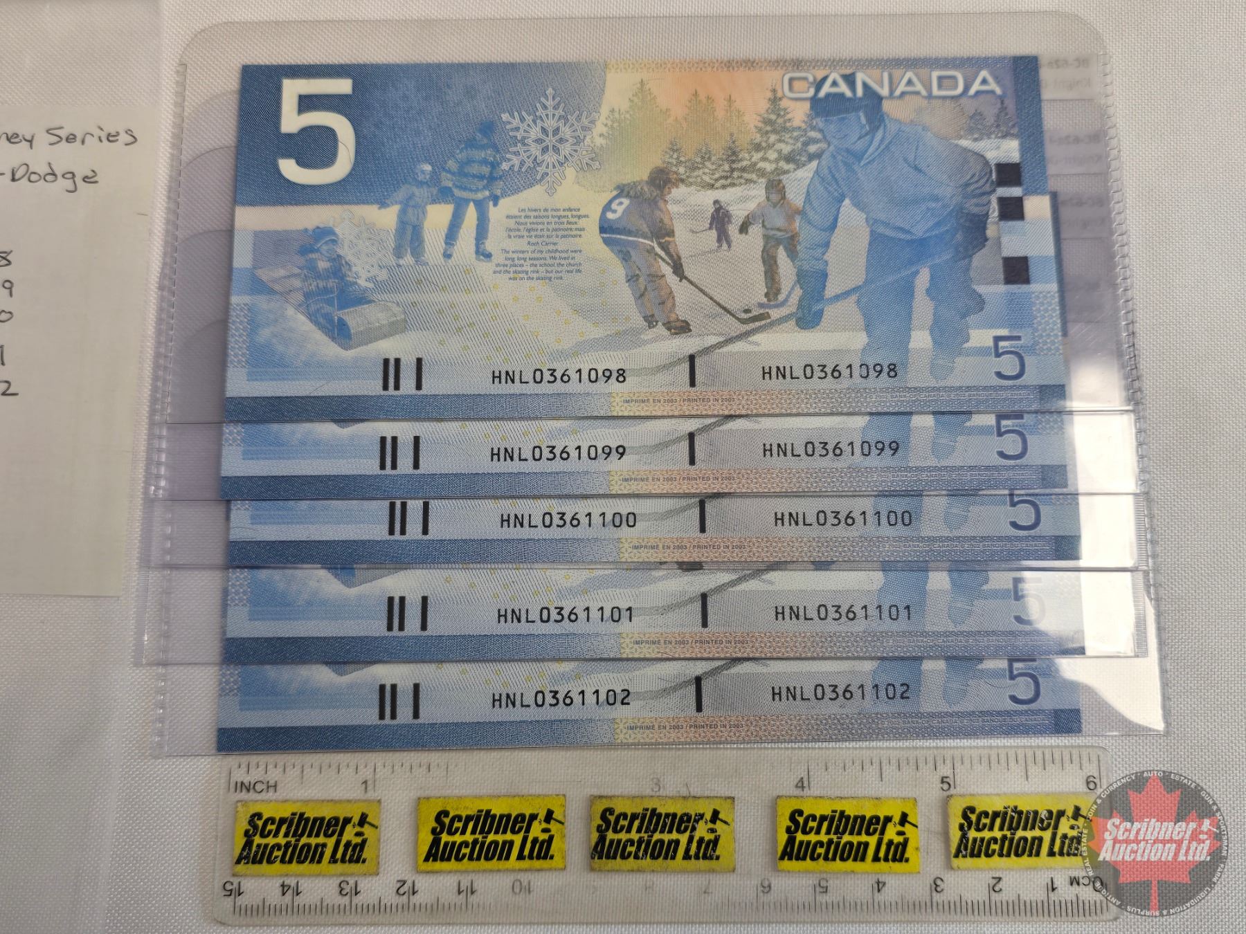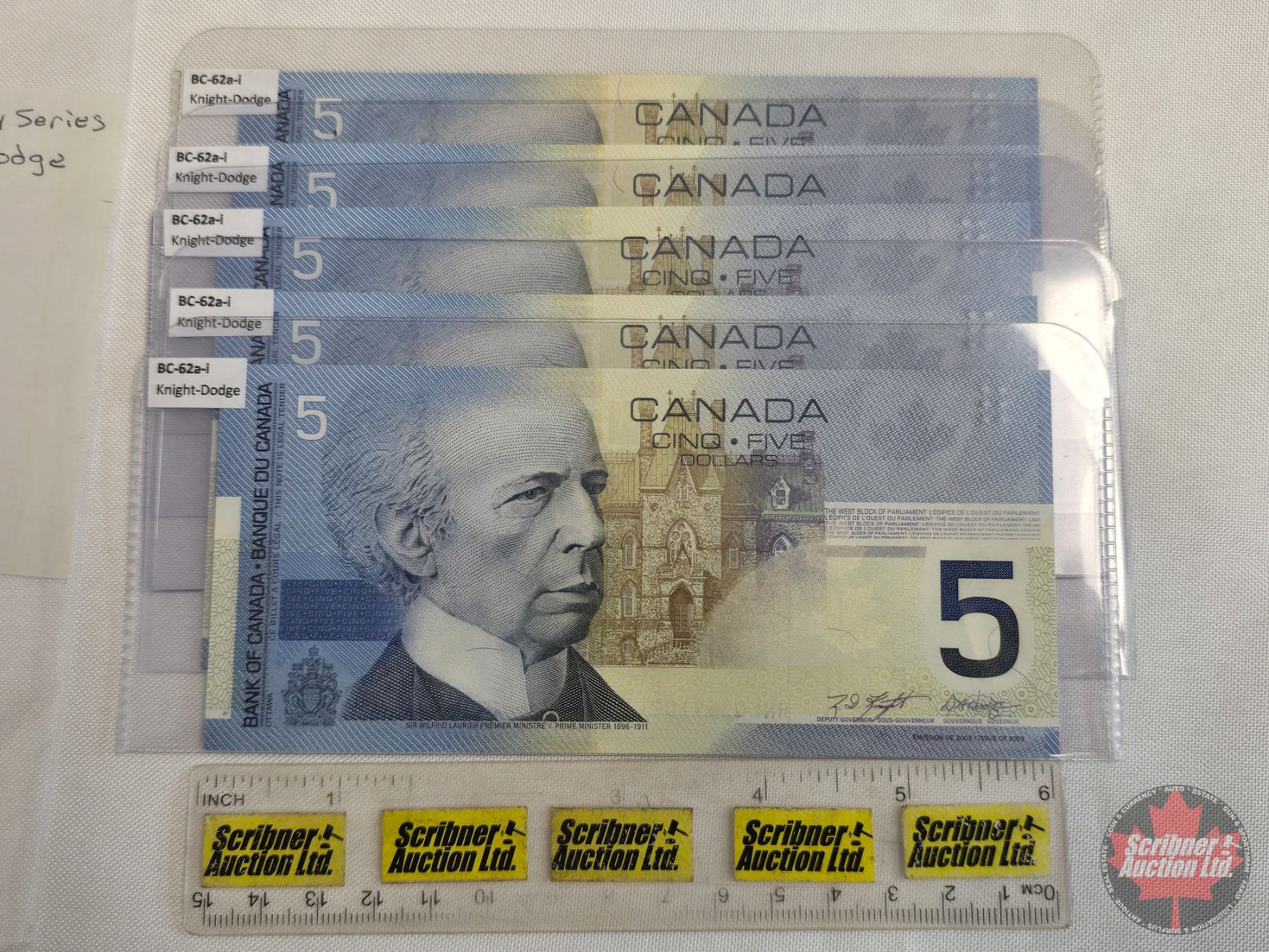 Canada $5 Bills 2002 (5 Sequential) : Knight/Dodge #HNL0361098-099-100-101-102