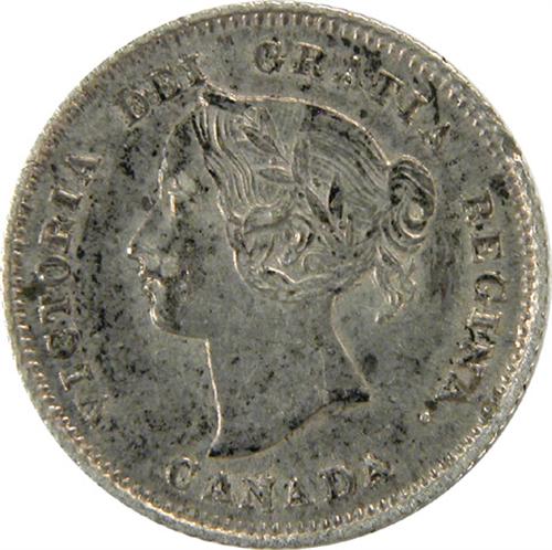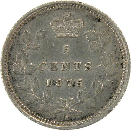 Canada Five Cents Silver 1875H Small Date EF. A very sharp example of the key date. It has a considerable remaining lustre and a light golden toning, and there some minor rim nicks