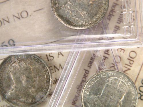 Canada Five Cents Silver 1902 ICCS AU-55 lightly toned, 1902H Small H ICCS EF-45 pale toned and 1909 Round Leaves ICCS EF-40 lightly toned. Total three pieces