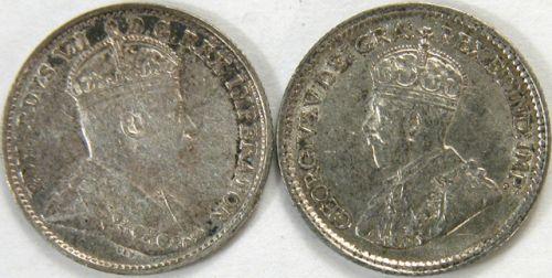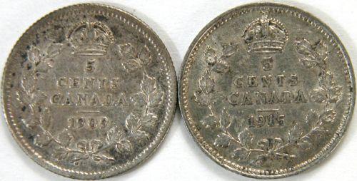 Canada Five Cents Silver 1909 Round Leaves and 1915. Two very lightly toned pieces, both EF