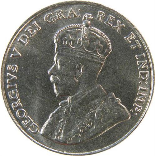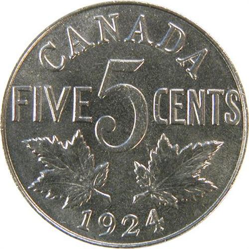 Canada Five Cents 1924 Choice Uncirculated. A virtually fully struck piece with full beads on the crown and just a hint of weakness on the left leaf