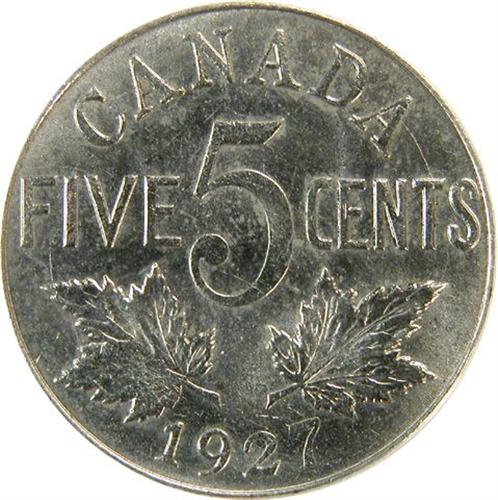 Canada Five Cents 1927 Choice Uncirculated or better. A fully struck obverse and some softness on the reverse