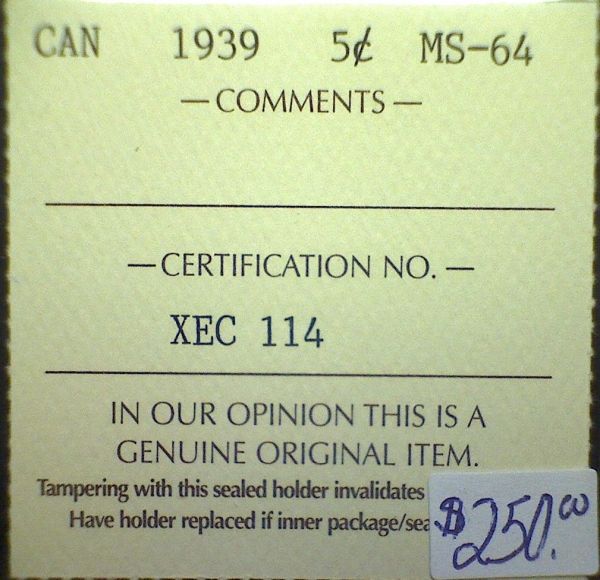 Canada - 5 Cents - 1939 - ICCS - MS-64