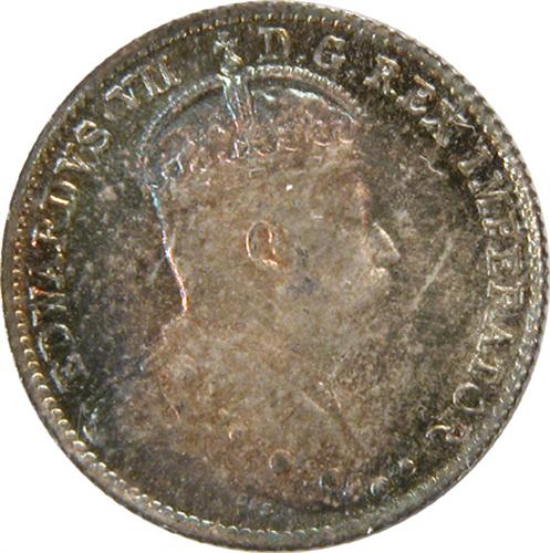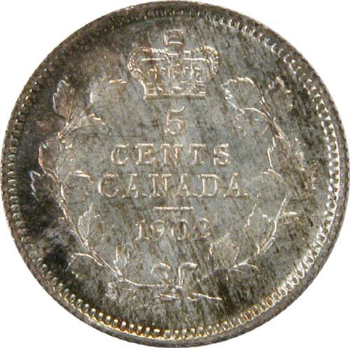 Canada Five Cents Silver 1902 ICCS MS-64. A fully struck piece with great lustre and beautiful light golden amber toning with overtones and accents in iridescent blues