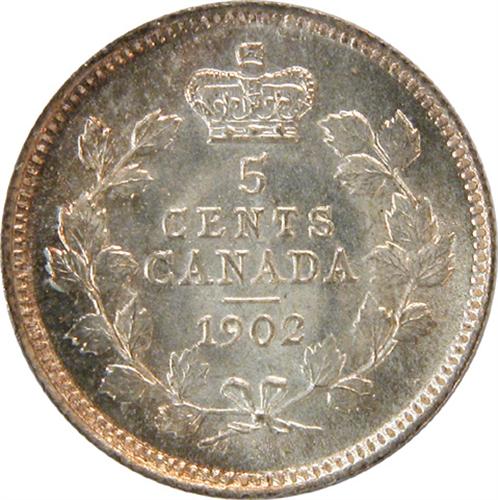 Canada Five Cents Silver 1902 ICCS MS-64. A fully struck piece with great lustre and beautiful light golden amber toning