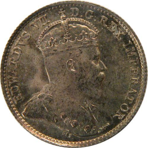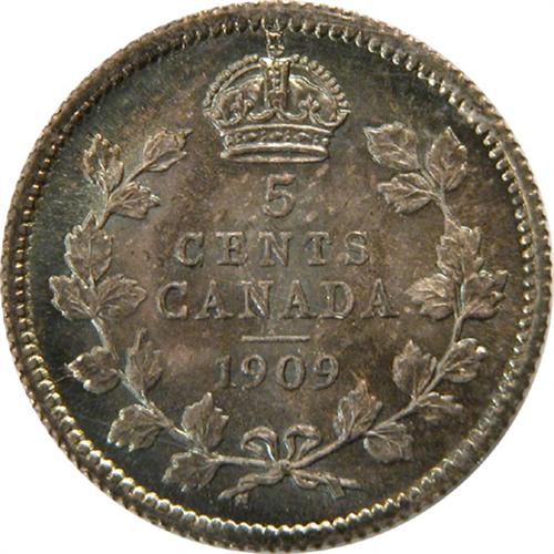 Canada Five Cents Silver 1909 Round Leaves ICCS MS-65 PQ. This is a fully struck example with great lustre and near flawless surfaces that are beautifully toned in light-medium golden olives with pale blue overtones offering Great Eye Appeal. It is tied as the second highest graded by ICCS