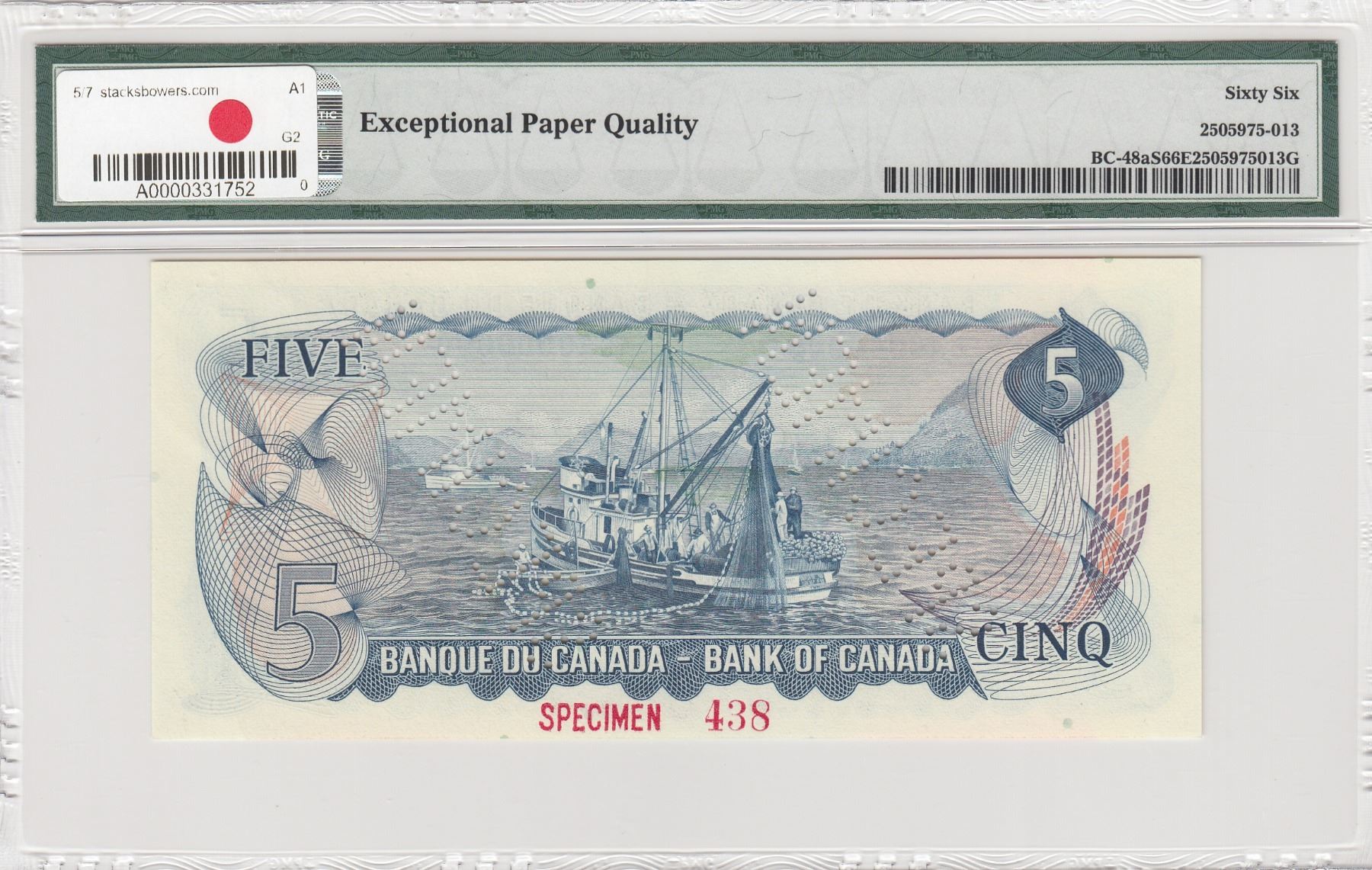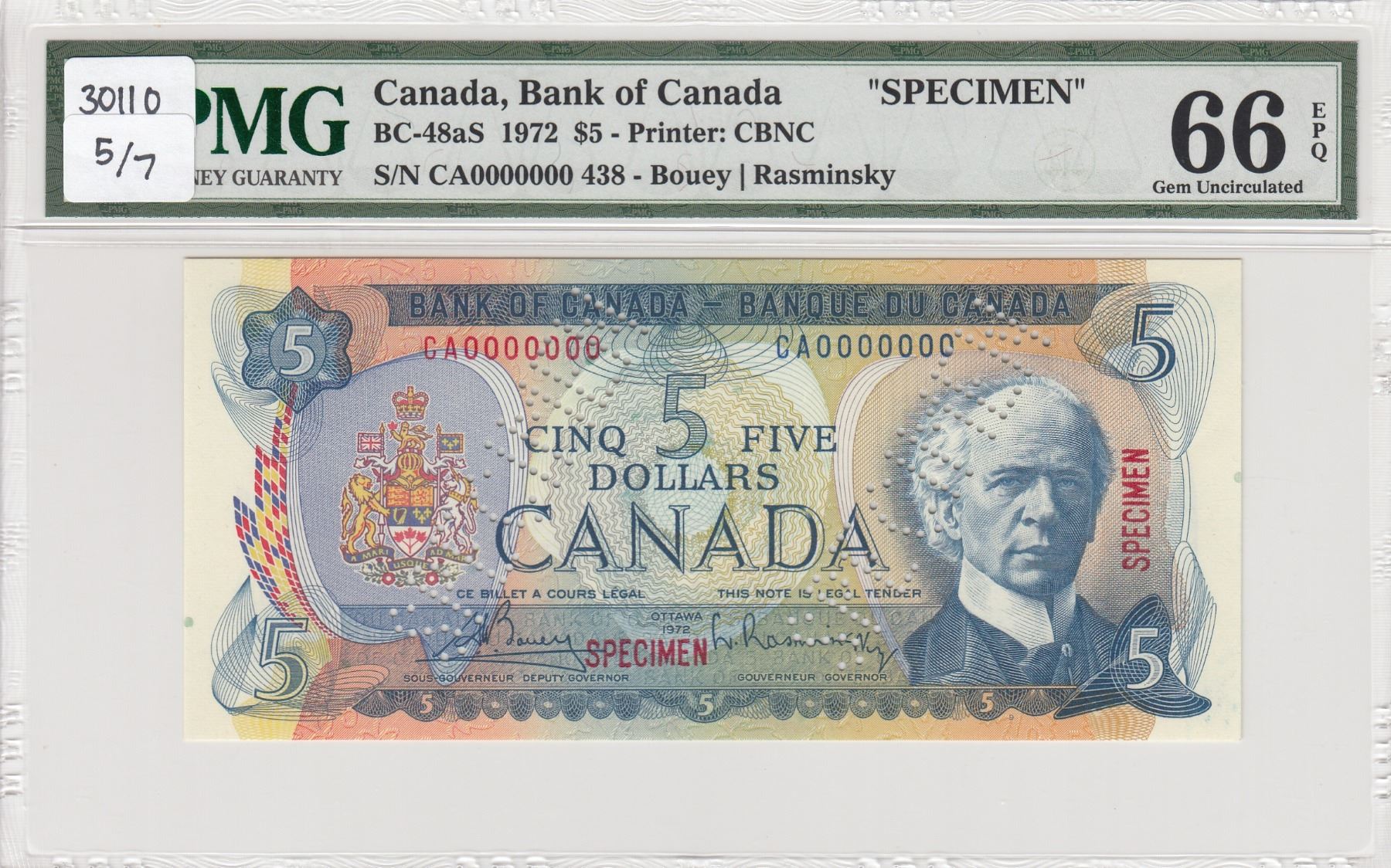 Canada, 5 Dollars, 1972, UNC, p87as, SPECIMENbr/PMG 66 EPQ, Queen Elizabeth II portrait, serial number: CA 00000000