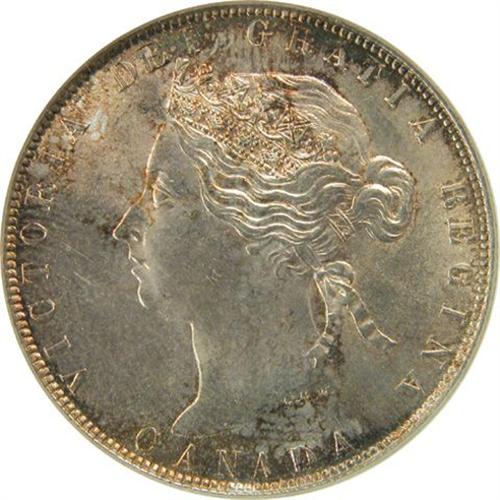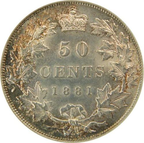 Canada Fifty Cents 1881H ICCS and NGC MS-63 PQ. This is a fully struck and superbly lustrous piece with rather flawless surfaces that are beautifully toned in light golds and ambers with iridescent blue accents at the rims adding to the overall Great Eye Appeal. It is one of only two mintstate examples graded by ICCS and it is the only mintstate example certified by NGC, while PCGS has graded three examples higher. From the Mason Collection