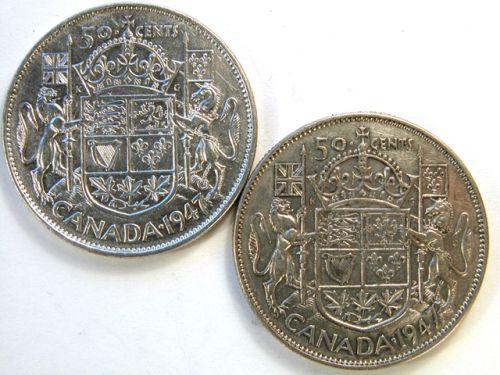 Canada Fifty Cents 1947 Curved 7 and 1947 Maple Leaf Straight 7. Two lightly toned pieces, both VF