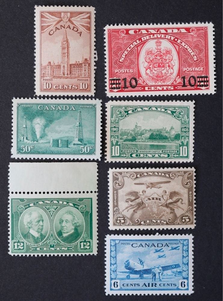Canada 7 Stamp Collection. All are mint. Included is 1942 10c S/C #257, 1935 10c S/C E9, 1935 10c S/C #215, 1928 5c S/C C1, 50c S/C #294, 1927 12c S/C #147, 1942 6c Air S/C #C7. Total S/C Value= $107.