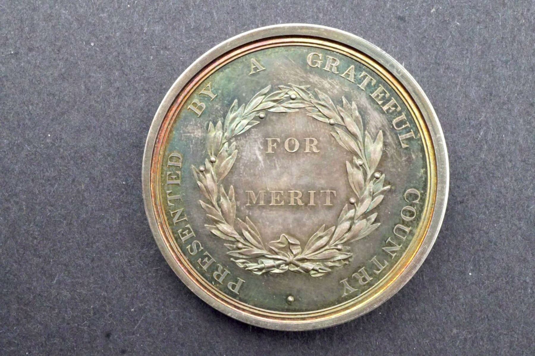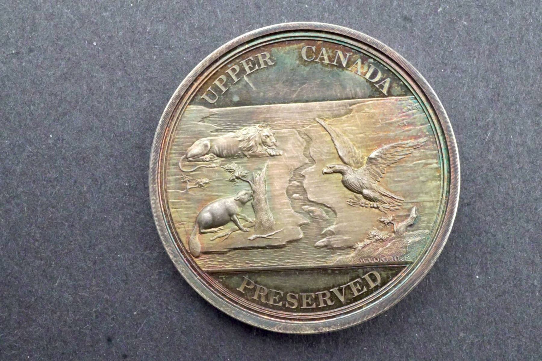 51 mm, 73.0 grams. Plain edge reverse without number. Obverse: UPPER CANADA PRESERVED Scene of the US / Canada border at the Niagara River (probably), with an eagle on one side & a beaver on the other. Reverse: A wreath. Around: PRESENTED BY A GRATEFUL COUNTRY within the wreath: FOR MERIT. Glossy proof or proof-like surfaces. The Upper Canada Preserved medal was struck by the Loyal and Patriotic Society of Upper Canada for "extraordinary instances of personal courage and fidelity in defence of the Province" during the War of 1812. The medal depicts the British lion protecting the Canadian beaver from a hovering American eagle. Flowing between them is the Niagara River. The inscription is: Upper Canada Preserved. The medal was never awarded because the war ended and the lyst of those entitled to receive it turned out to be too long for the society's limited budget.