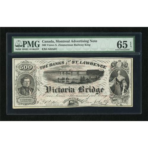 <B>Canada, Advertising Note, Victoria Bridge</B></I><BR> This is a neat piece of Canadian propaganda put out by S. Zimmerman Railway King. <B>PMG Gem Uncirculated 65 EPQ</B></I>.<BR><BR><b>Shipping:</b> Coins & Currency (<a target="_blank" href="http://www.heritageauctions.com/common/shipping.php">view shipping information</a>)