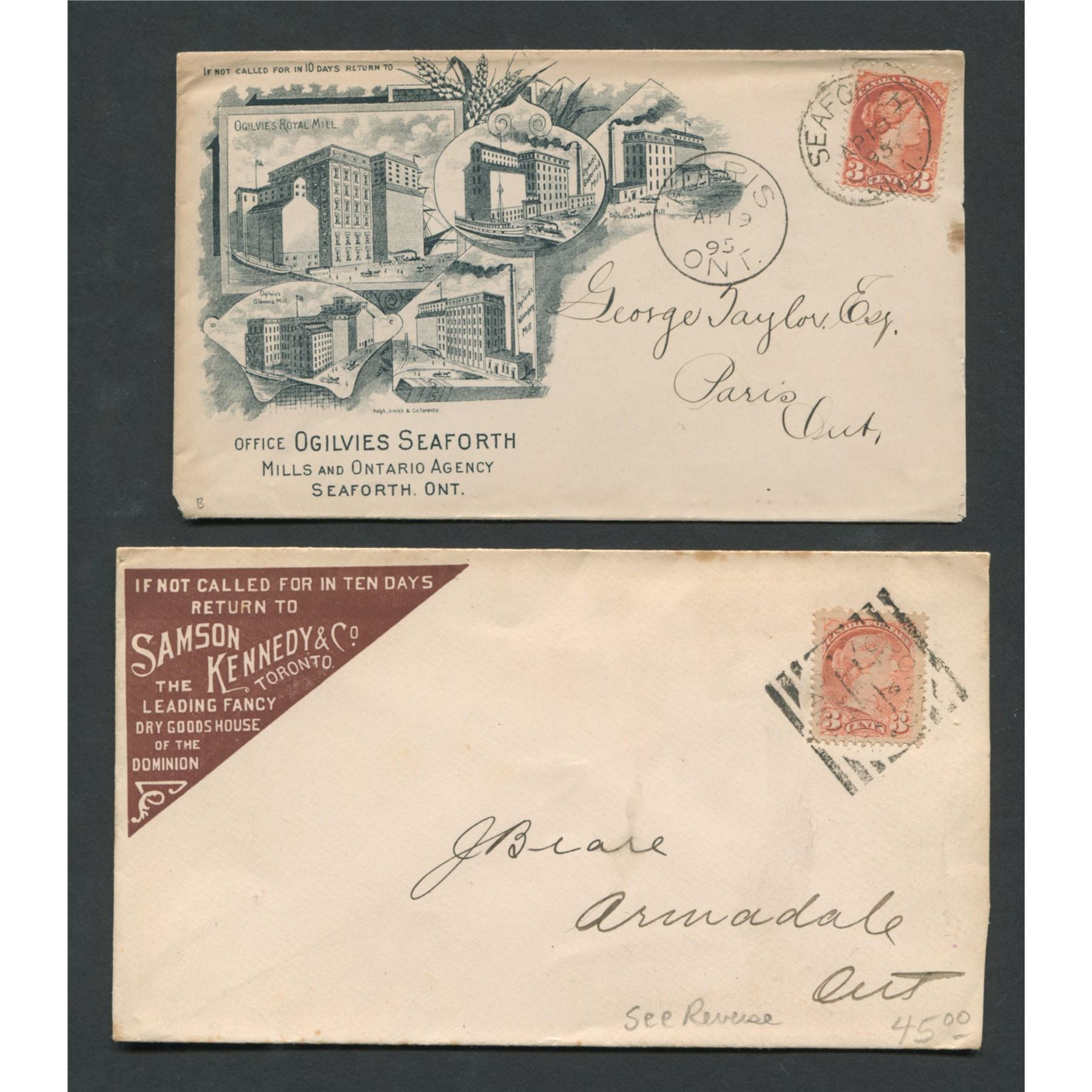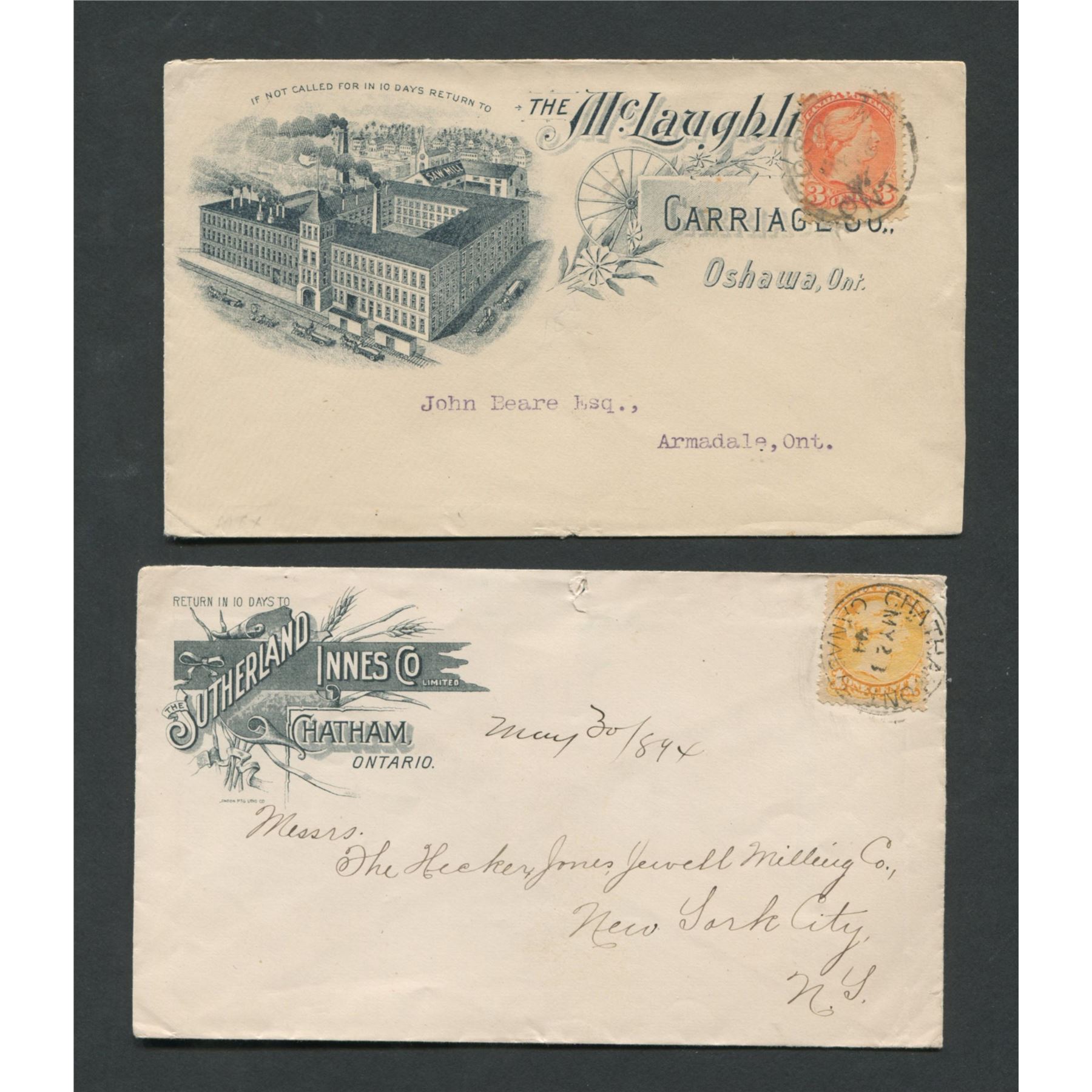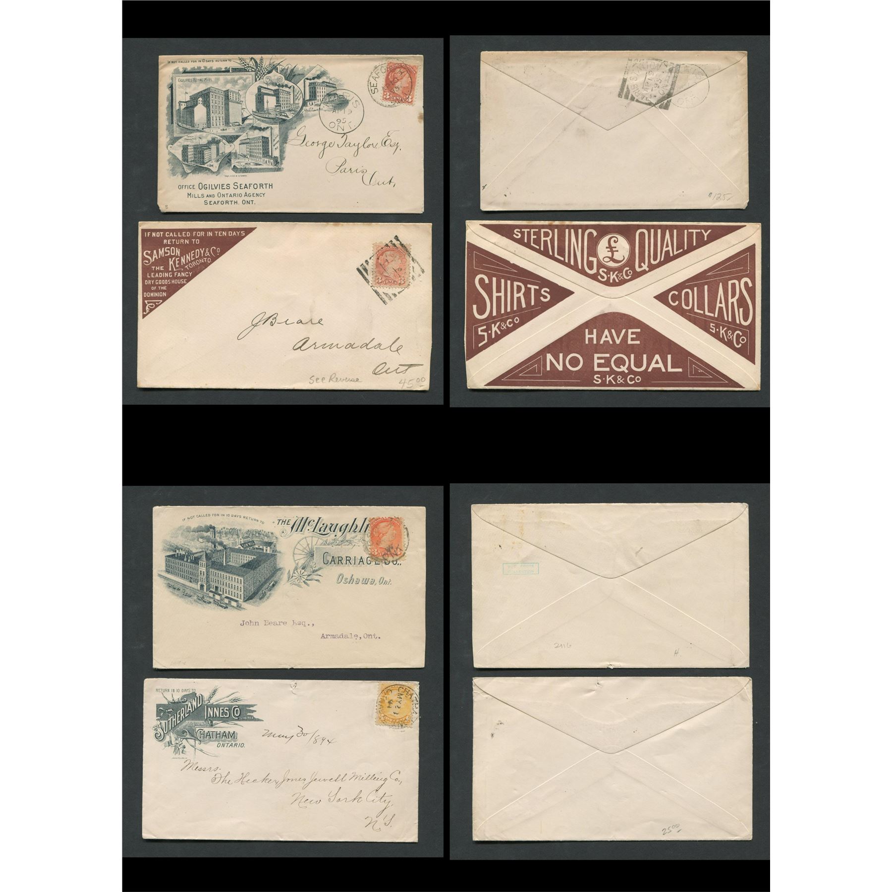 Canada advertising stamp cover collection. This collection contains 4 covers. All stamps are Victoria. Sutherland Innes Co. Chatham 1894 1 cent, The McLaughli Carriage Co. Oshawa 3 cent, Office Ogilvies Seaforth Mills and Ontario Agency Sutherland 1895 3 cent, Samson Kennedy & Co. 3 cent.