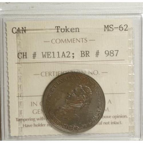 <B>Canada B-987 Token MS62 ICCS.</B></I> An outstanding Canadian Breton token, B-987/WE11A2. The token exhibits iridescent toning with a blue/green hue. <BR><BR><b>Shipping:</b> Coins & Currency (<a target="_blank" href="http://www.heritageauctions.com/common/shipping.php">view shipping information</a>)