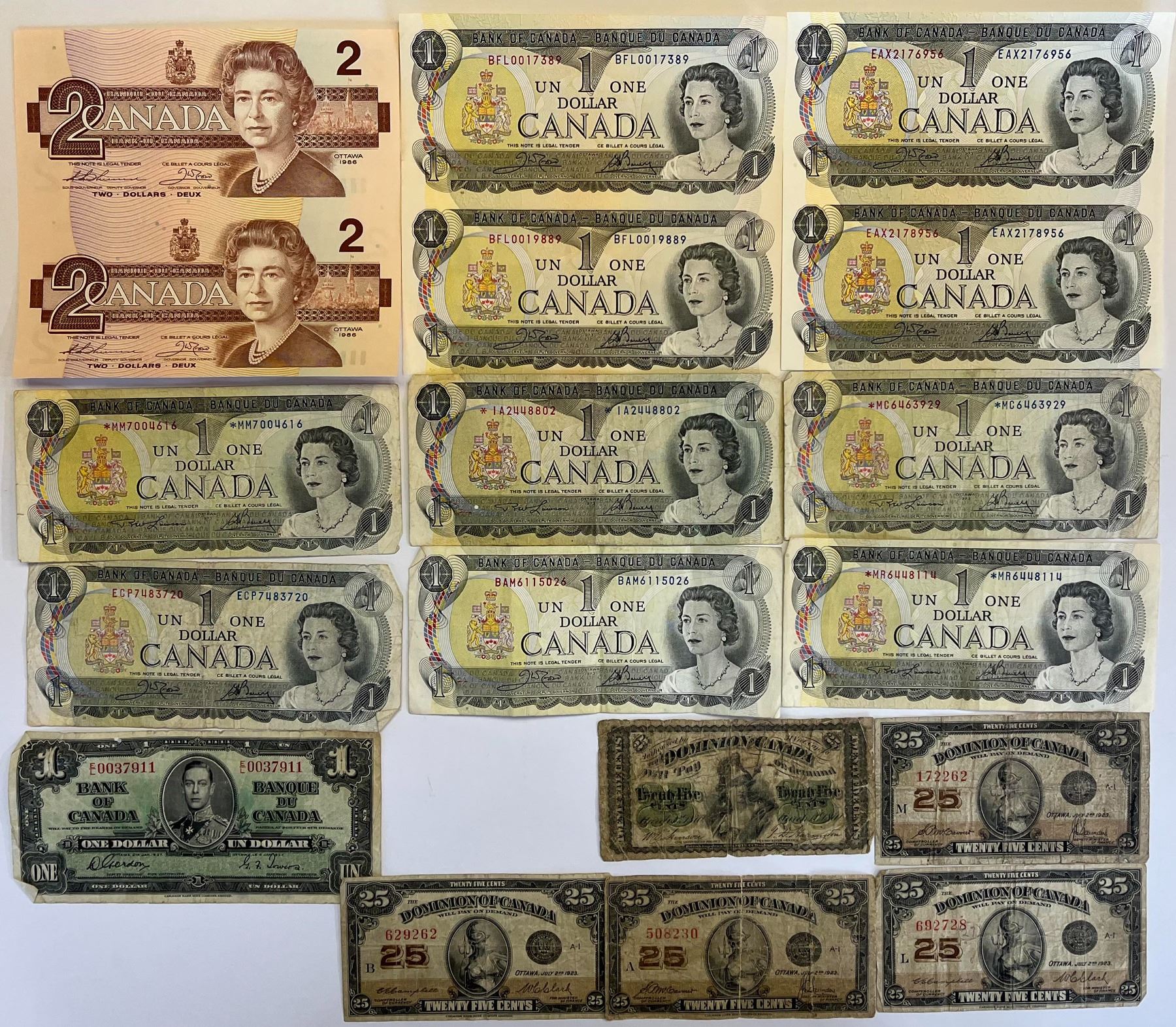 Canada Banknote lot; 1870-1986. includes shinplasters, uncut pairs, replacements and more. Various denominations and grades. An interesting lot.