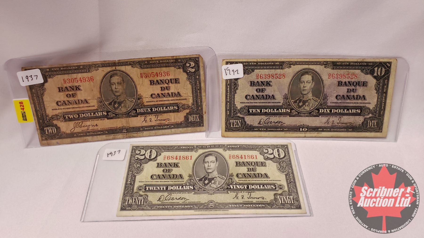 Canada Bills 1937 (3) : $2 ; $10 ; $20 (See Pics for Signatures/Serial Numbers)
