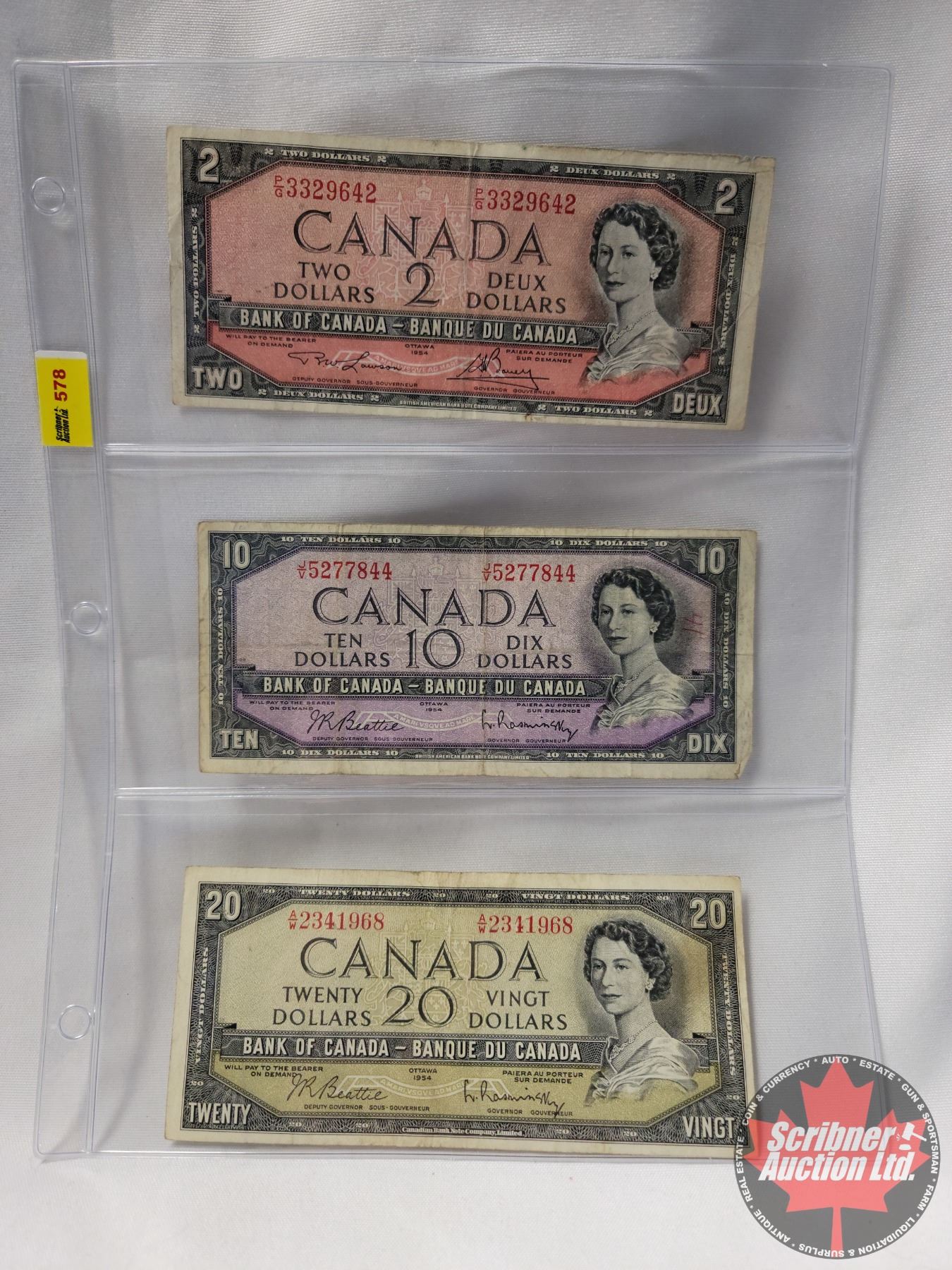 Canada Bills 1954 (3): $2 Bill; $10 Bill; $20 Bill (See Pics for Serial Numbers & Signatures)