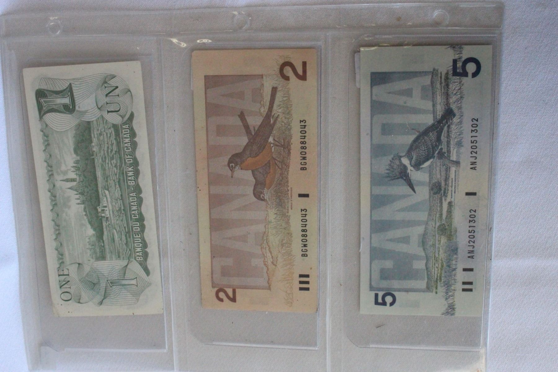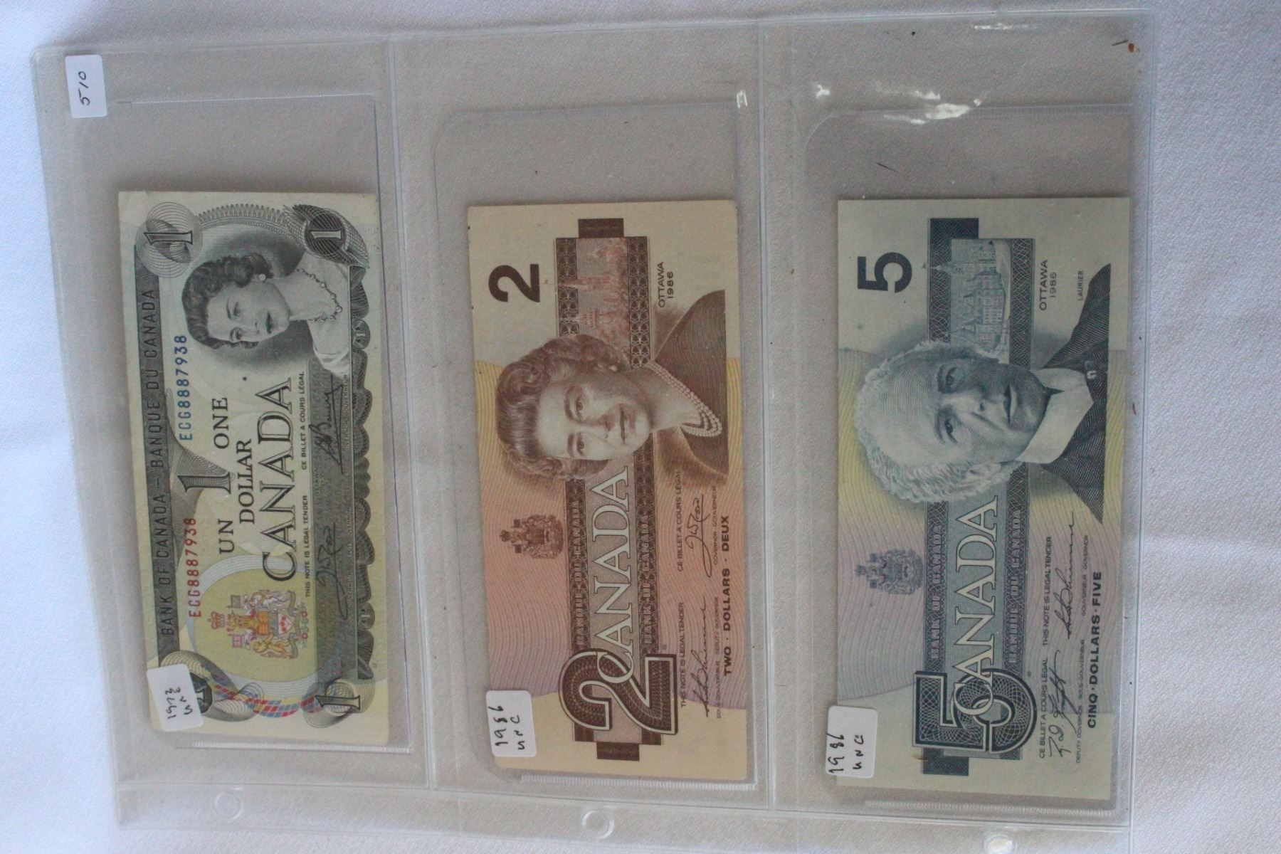 (1)One Dollar Bill - 1973, Unc., Crow/Bouey, ECG8887938; (1) Two Dollar Bill, 1986, Unc., Thiessen/Crow, BGW0884043; (1) Five Dollar Bill, Unc., Knight/Thiessen, ANJ2051302