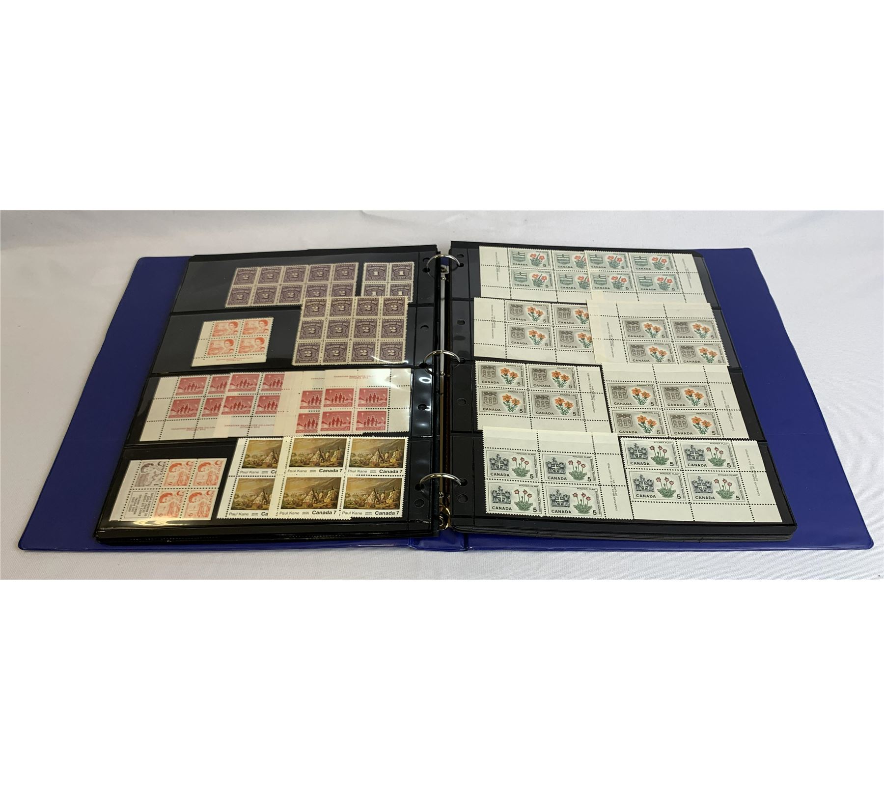 Canada Blocks, Corner Blocks, Panes & Booklets collection. This collection contains 15 sheets, housed in a blue binder. Included is 26- #401a MNH. Please see photos.