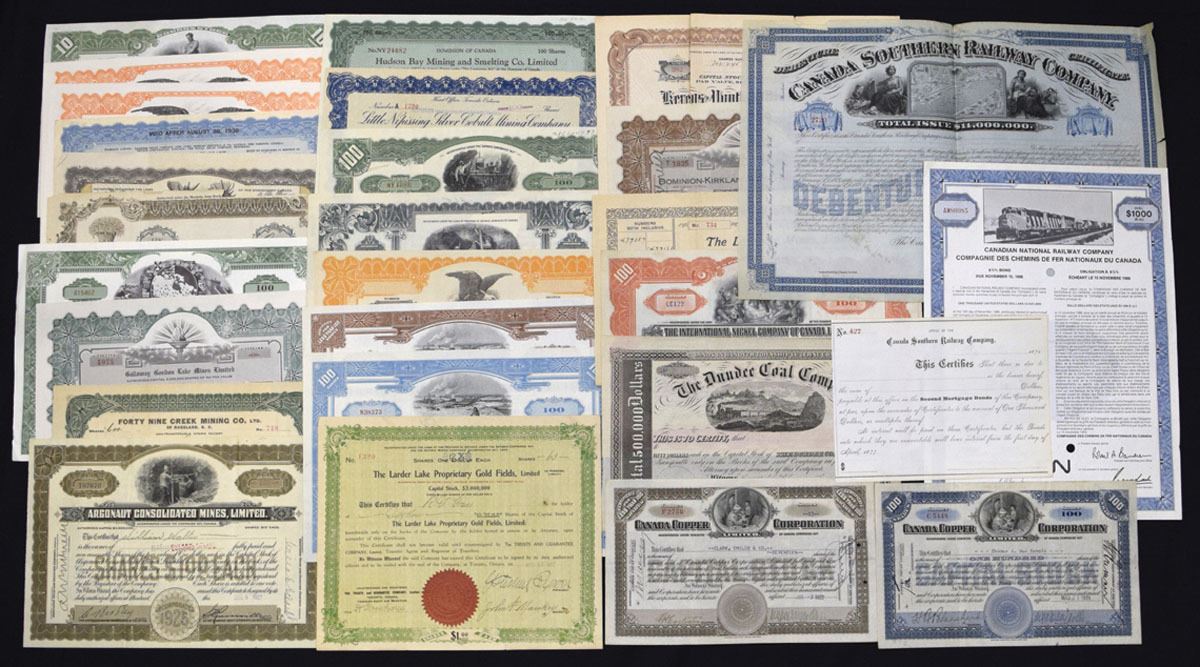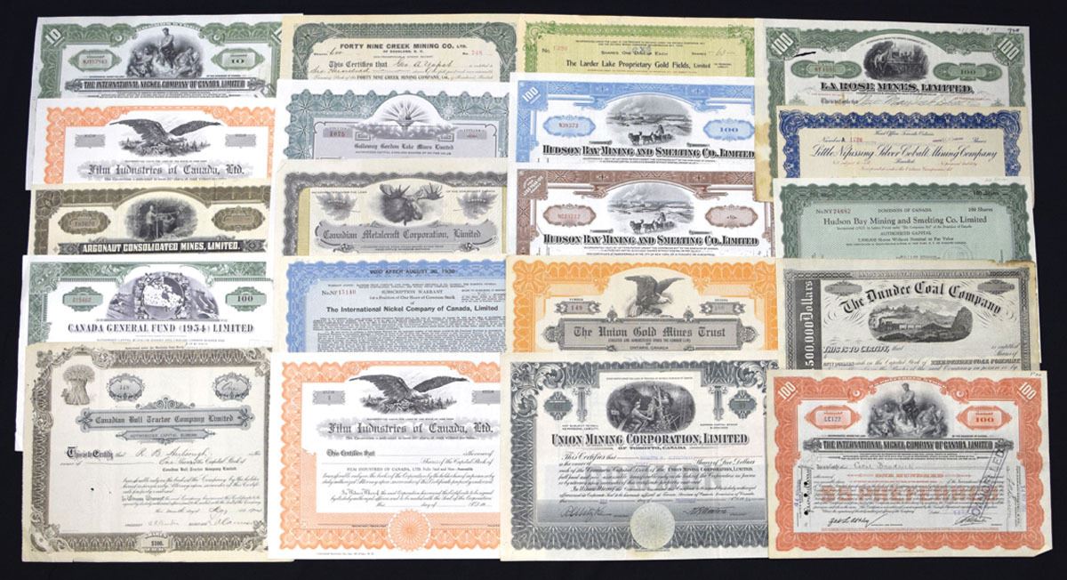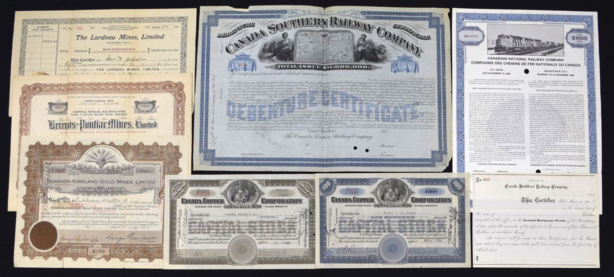 Canada, ca. 1870s-1950s. Lot of 25+ I/U and I/C Canadian mining and railway enterprises, with attractive engraved vignettes of allegorical figures, locomotives, mining scenes, and industrial motifs. Highlights include: Canada Southern Railway Co.; Canadian National Railway Co.; Hudson Bay Mining & Smelting Co.; Argonaut Consolidated Mines, Ltd.; Dominion-Kirkland Gold Mines, Ltd.; and Canada Copper Corp. Certificates are presented in multiple colors including green, blue, orange, and brown, with both share and bond issues represented. Condition ranges VF to XF, with folds, punch and ink cancellations, and some edge wear. (25+). Sold "AS IS" no returns accepted.