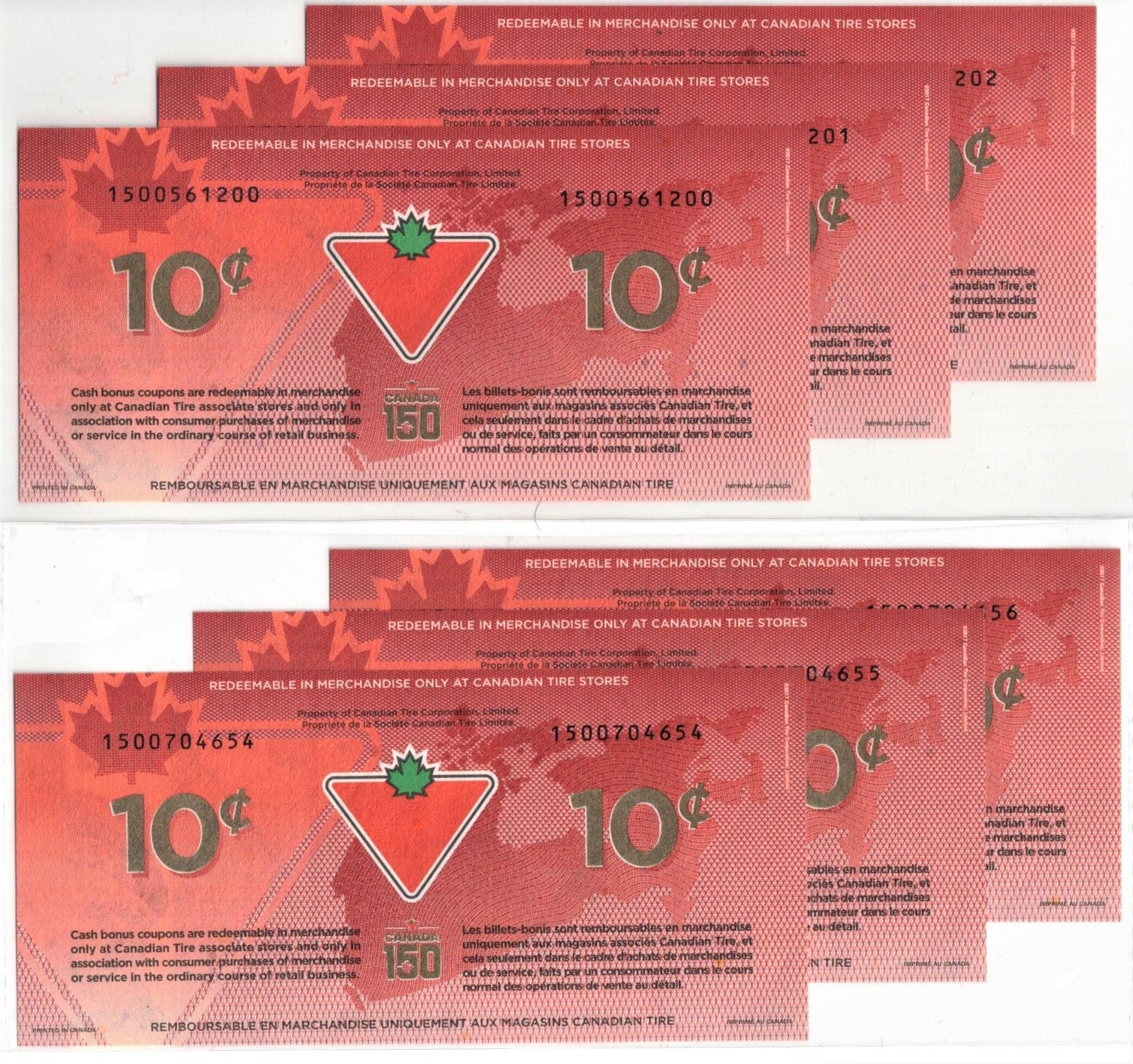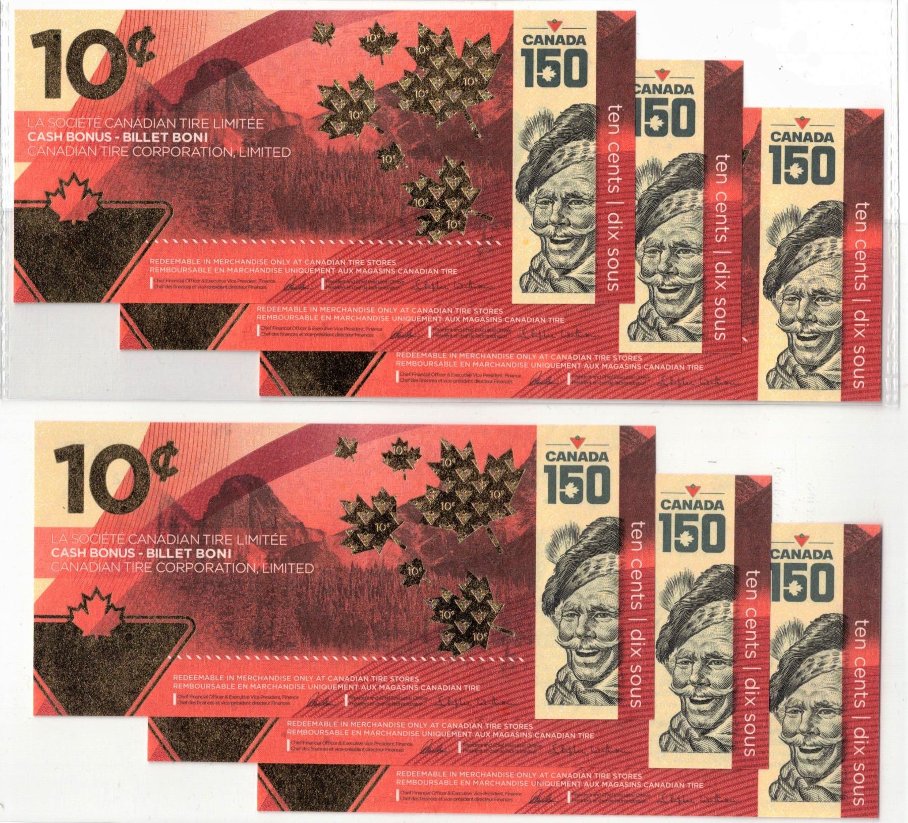 Canada, Canadian Tire Money 0.10c 2 (two) trios Consecutive (6) 150th Canada UNC, Scarce