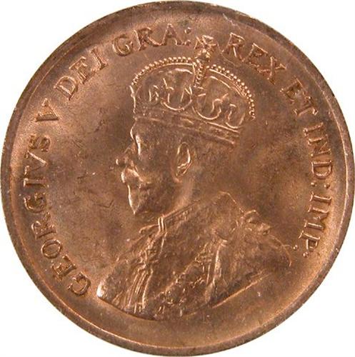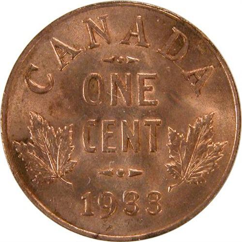 Canada Small Cent 1933 ICCS MS-64 Red. This is a fully struck piece with great lustre and rather flawless surfaces that are about 95% red. It is tied seventh highest by ICCS
