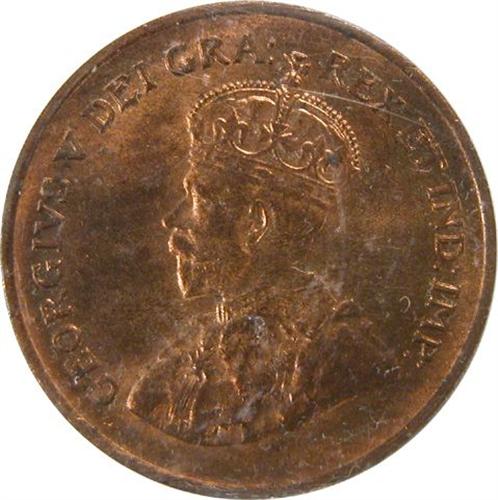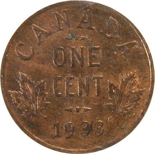 Canada Small Cent 1933 ICCS MS-64 Red. A fully struck and strongly lustrous piece with rather flawless surfaces that are about 70% red. It is tied seventh highest by ICCS