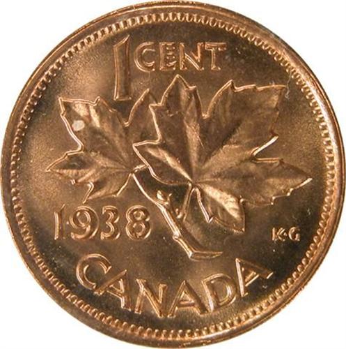 Canada Cent 1938 ICCS MS-64 Red. Virtually full red