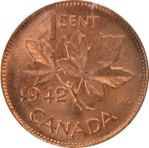 Canada Small Cent 1942 ICG MS-64 Red. About 75% red