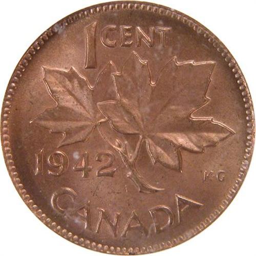 Canada Small Cent 1942 ICG MS-65 Red. About 75% red