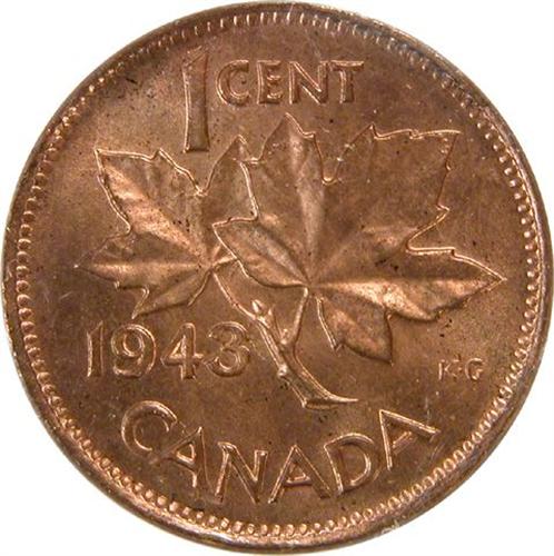 Canada Small Cent 1943 ICCS MS-64 Red. About 75% red