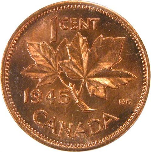 Canada Small Cent 1945 ICCS MS-64 Red Lacquered. Over 90% red protected by professionally applied lacquer